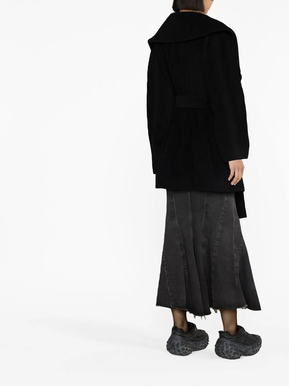 black cotton-wool blend belted waist classic lapels V-neck long sleeves straight hem