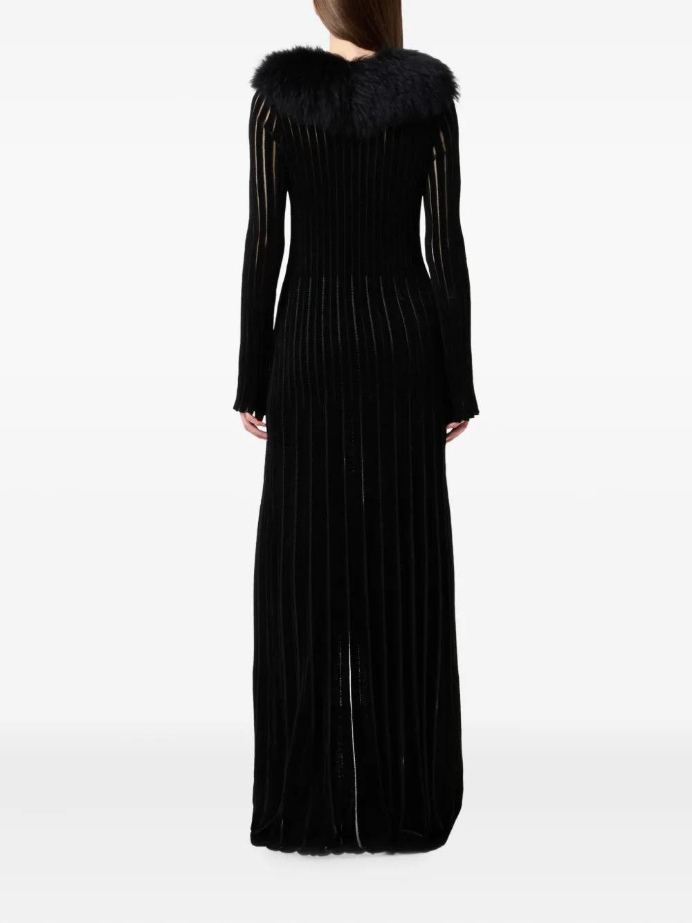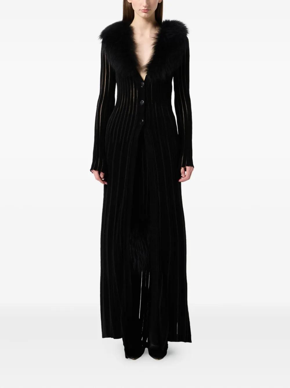 black ribbed knit faux-fur collar button front long sleeves floor-length
