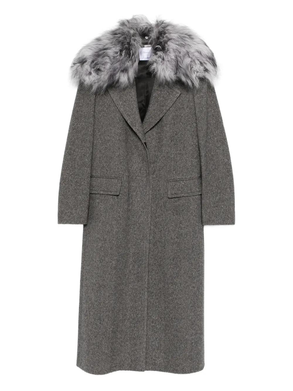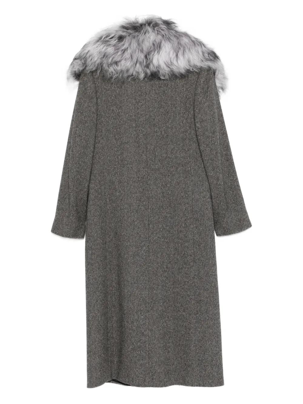 grey fur collar herringbone pattern front pockets long sleeves button fastening