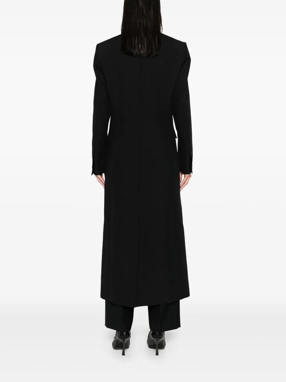 black recycled polyester tailored design double-breasted button fastening peak lapels shoulder pads long sleeves buttoned cuffs two front flap pockets central rear vent full lining straight hem mid-length