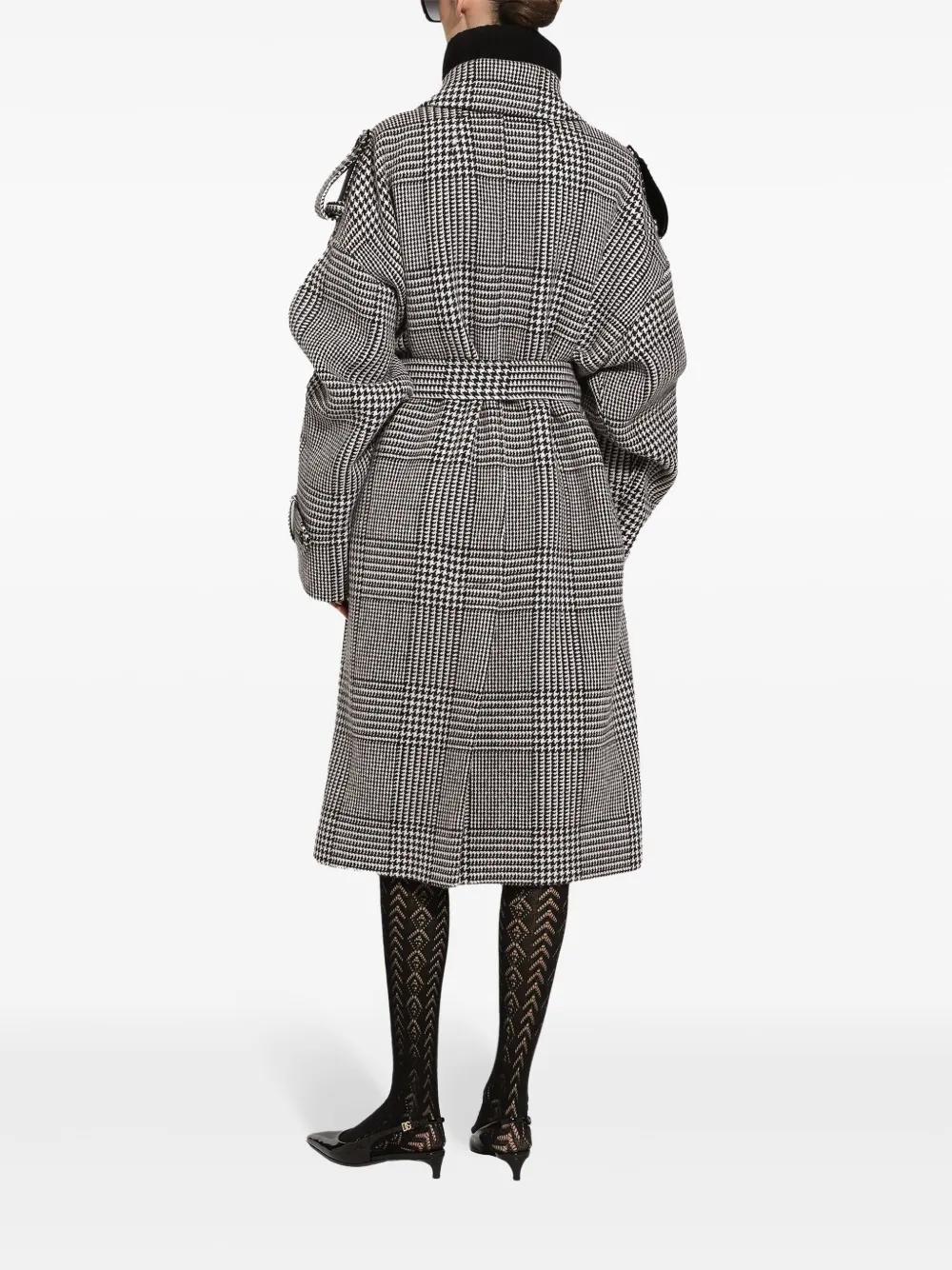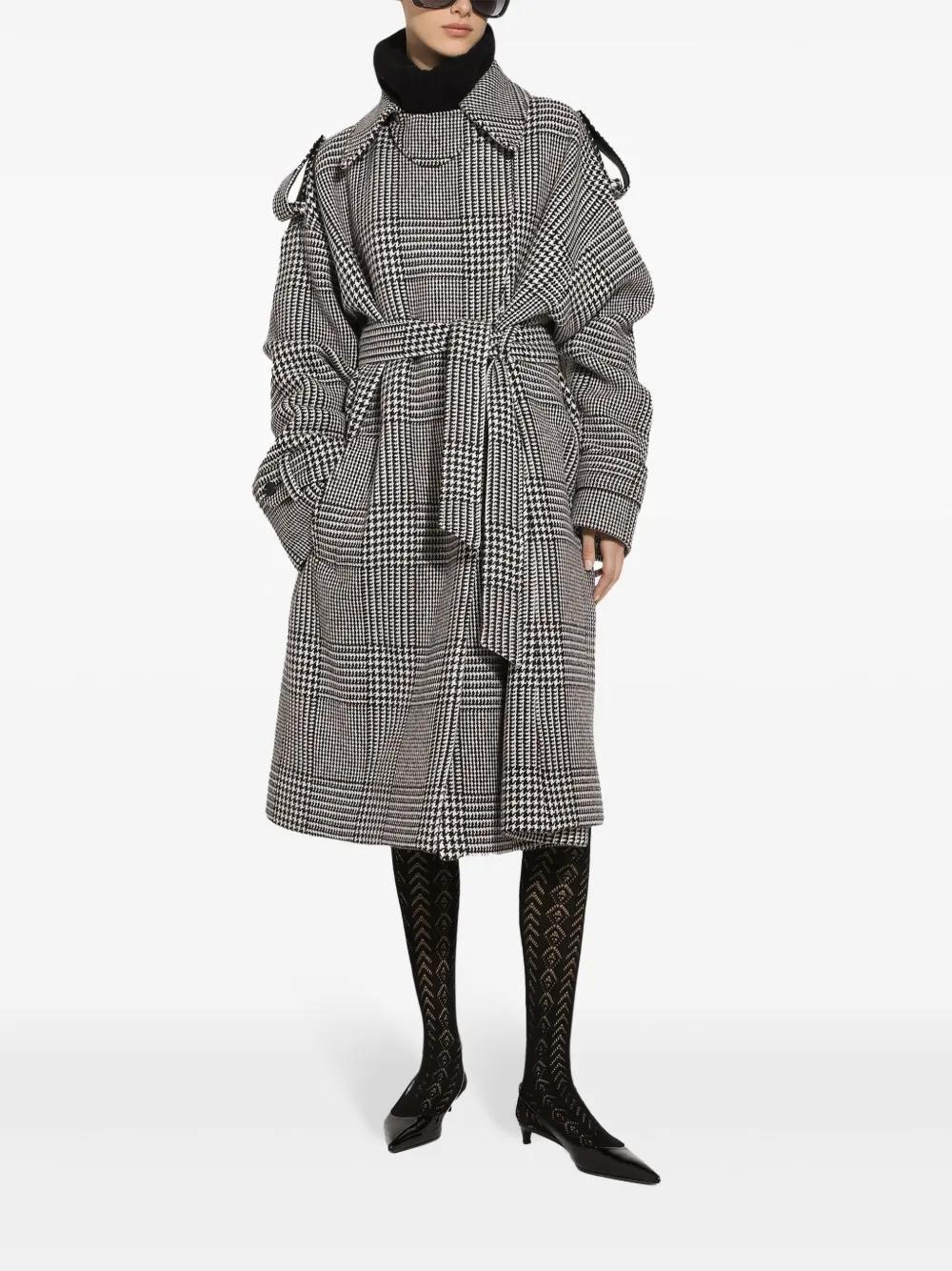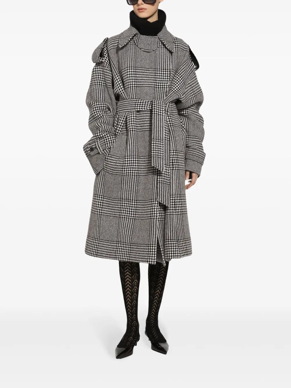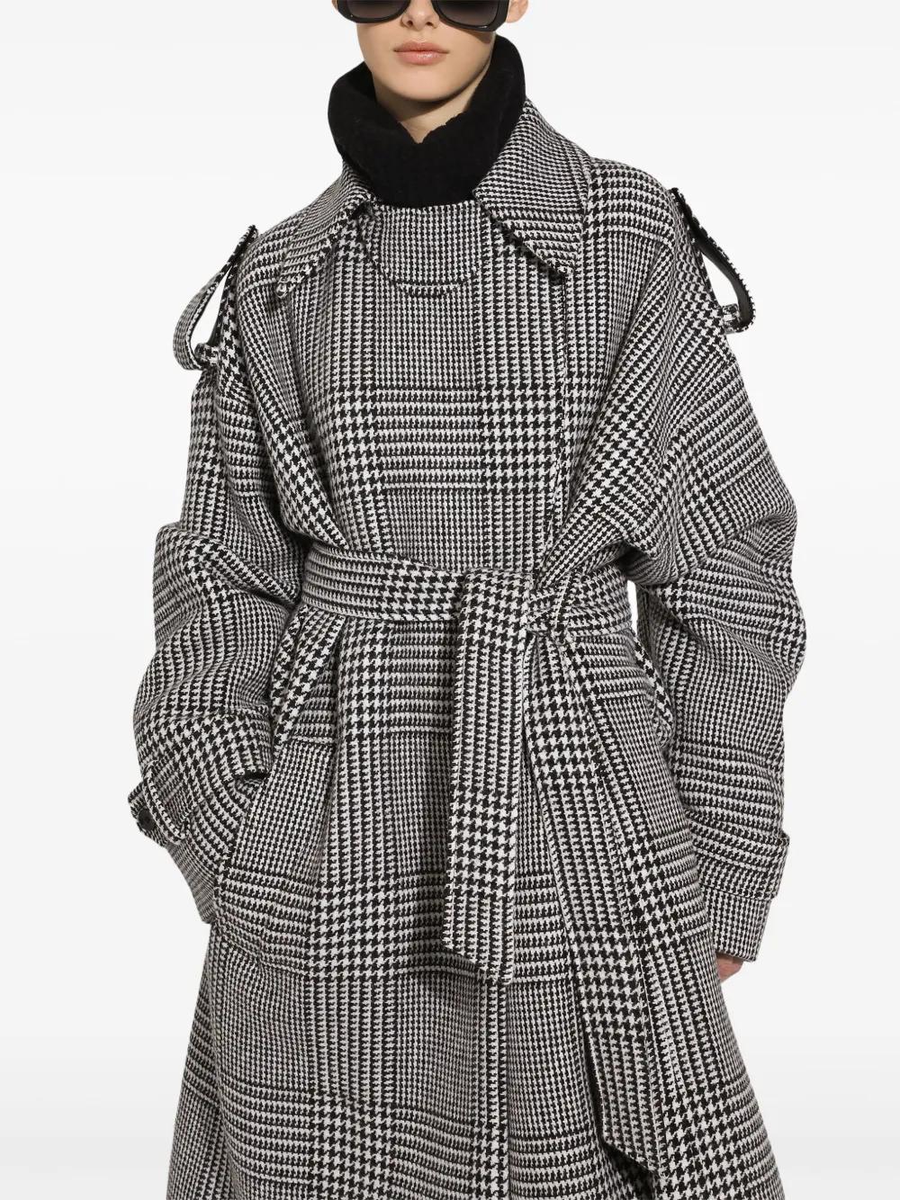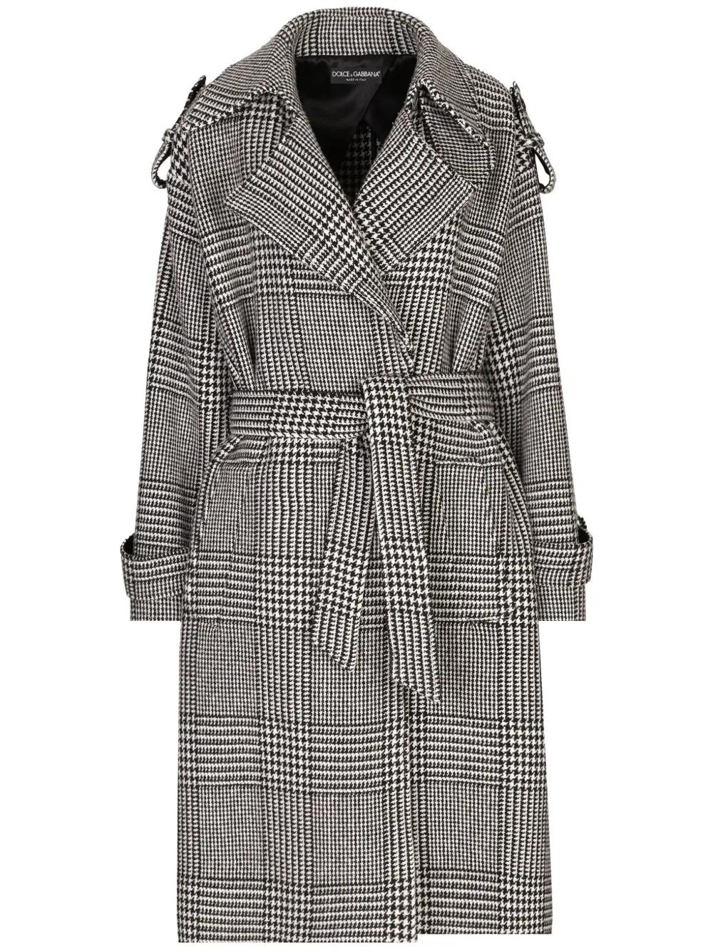 medium grey virgin wool blend check pattern belted waist notched lapels concealed front fastening slip pockets to the sides long sleeves straight hem knee-length