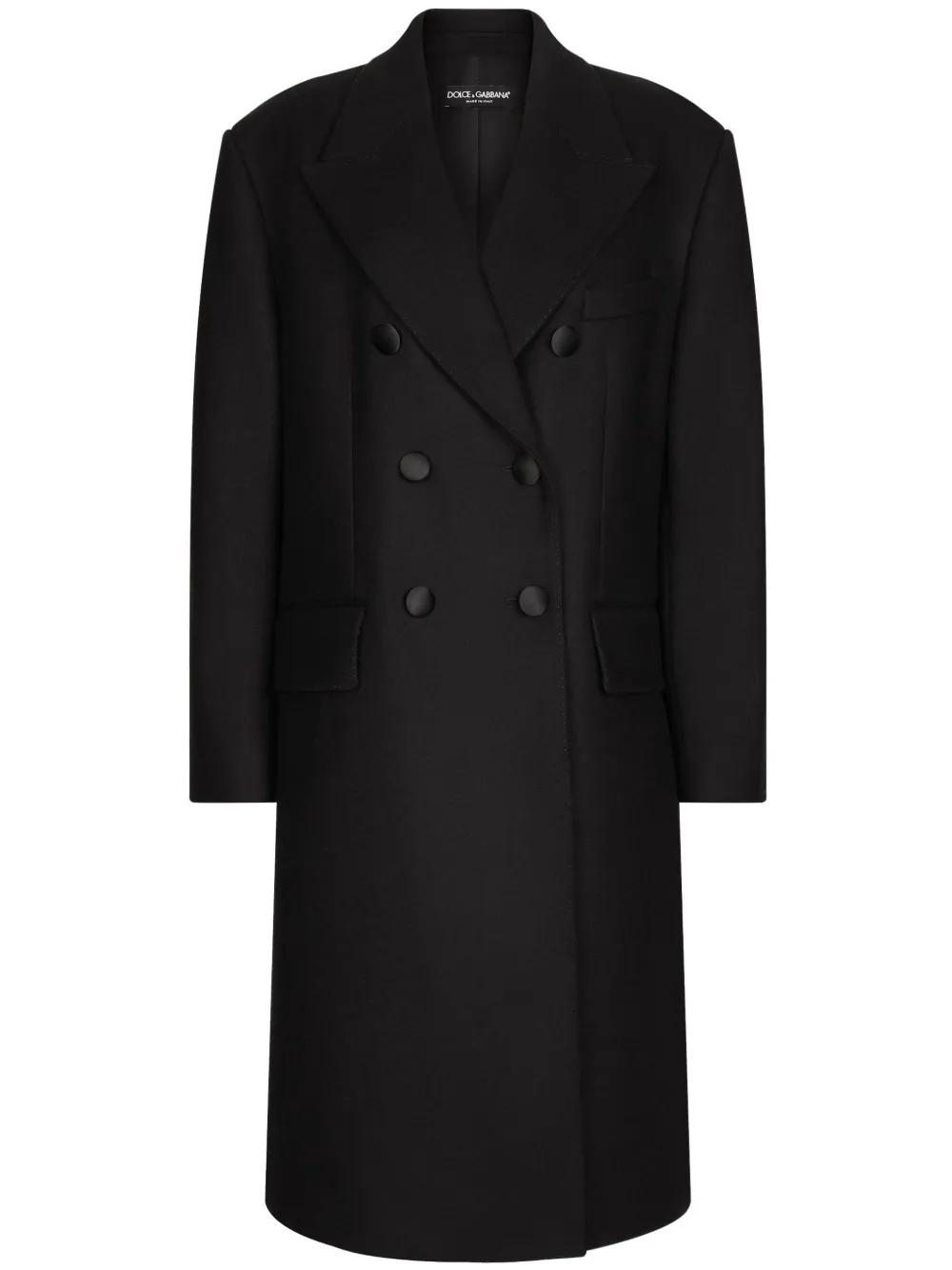 black silk virgin-wool blend double-breasted button fastening peak lapels long sleeves two side flap pockets below-knee length straight hem