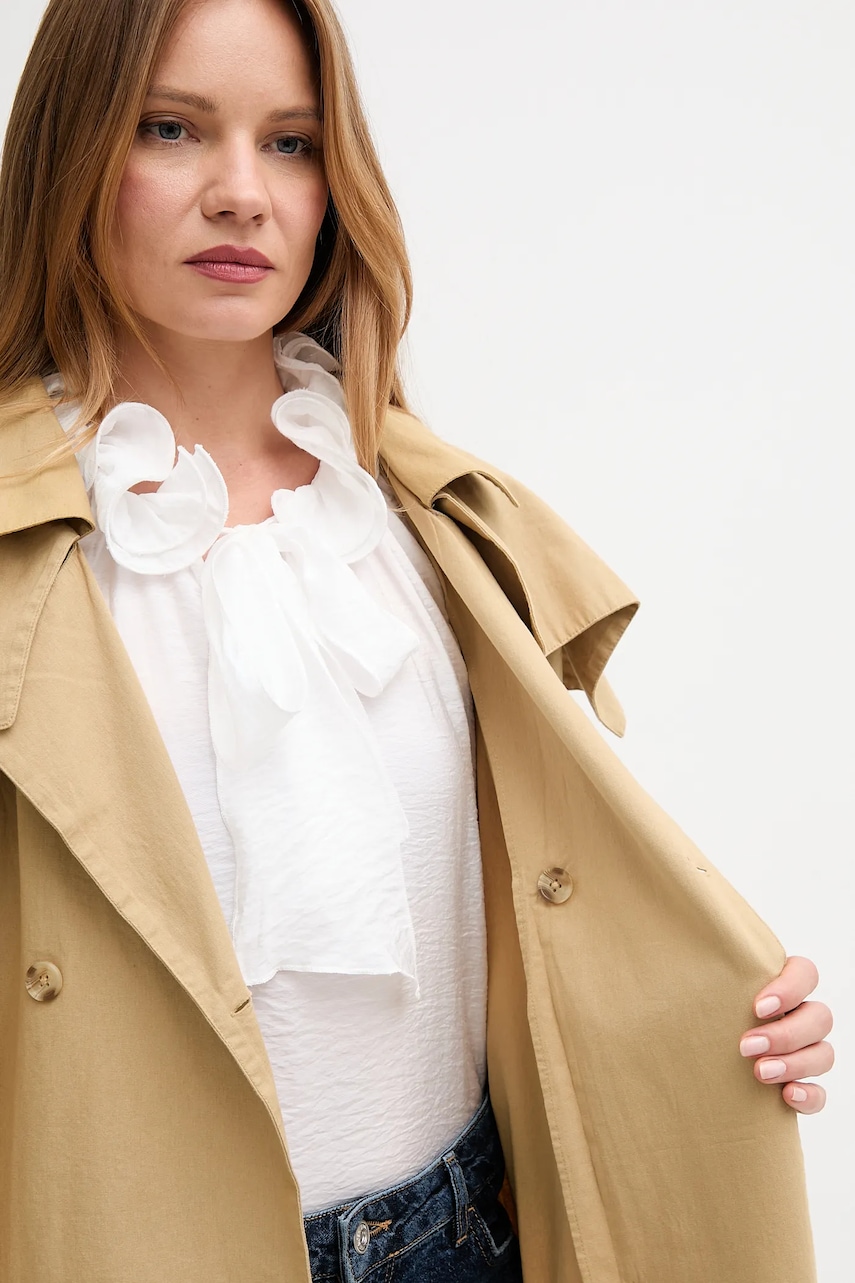 - Produkt z serii investing in better cotton™. Better Cotton to wiodąca na świecie inicjatywa na rzecz zrównoważonego rozwoju bawełny, której misją jest pomoc społecznościom bawełnianym w przetrwaniu i rozwoju, przy jednoczesnej ochronie i odbudowie środowiska. - Luźny krój zapewniający pełną swobodę ruchów. - Nieocieplony model bez podszewki. - Klasyczne klapy. - Dwurzędowe zapięcie na guziki. - W talii pasek, który modeluje sylwetkę i dodatkowo podkreśla talię. - Krój rękawa z obniżoną linią ramion nie ogranicza mobilności. - Tekstylne paski u dołu rękawów. - Na ramionach pagony. - Z tyłu rozcięcia, które zapewniają swobodę podczas poruszania się oraz lepsze układanie się materiału. - Cienka, lekko elastyczna tkanina. - Długość rękawa(mierzona od kołnierza): 72 cm. - Długość: 125 cm. - Szerokość pod pachami: 62 cm. - Wymiary podane dla rozmiaru: XS/S.