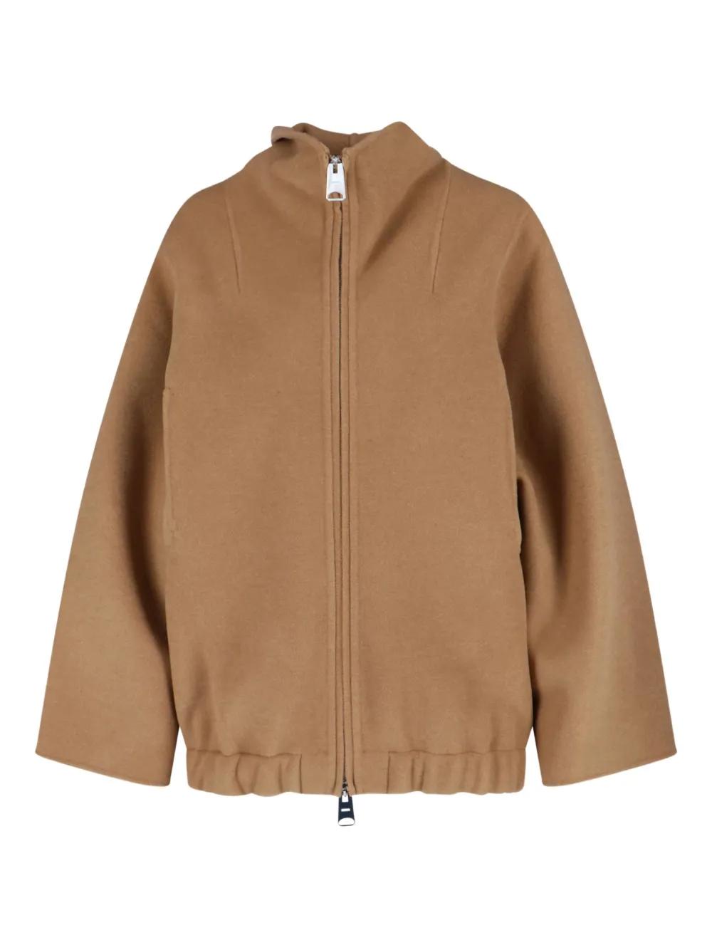 brown zip fastening elasticated hem wide sleeves high neck side welt pockets