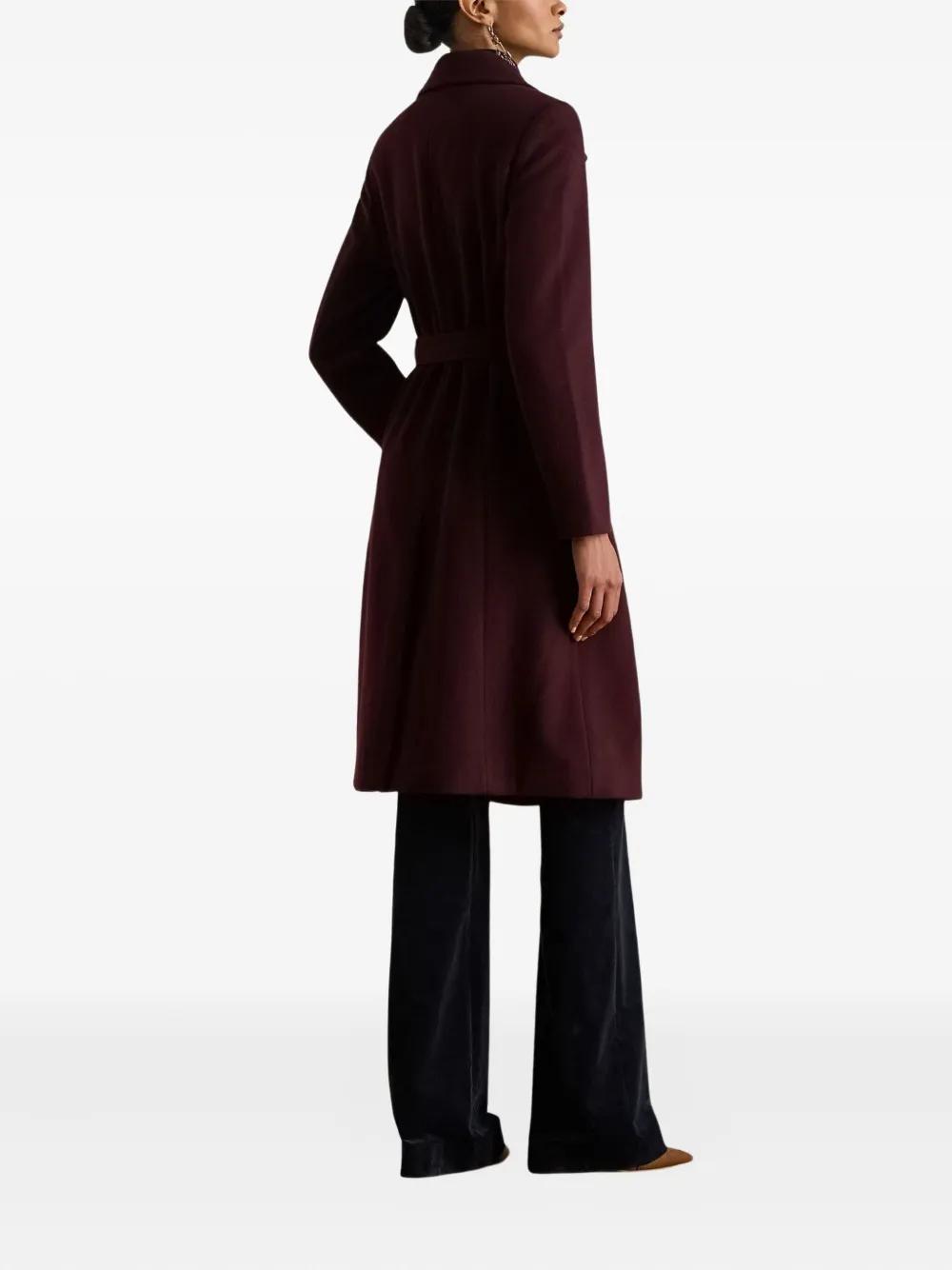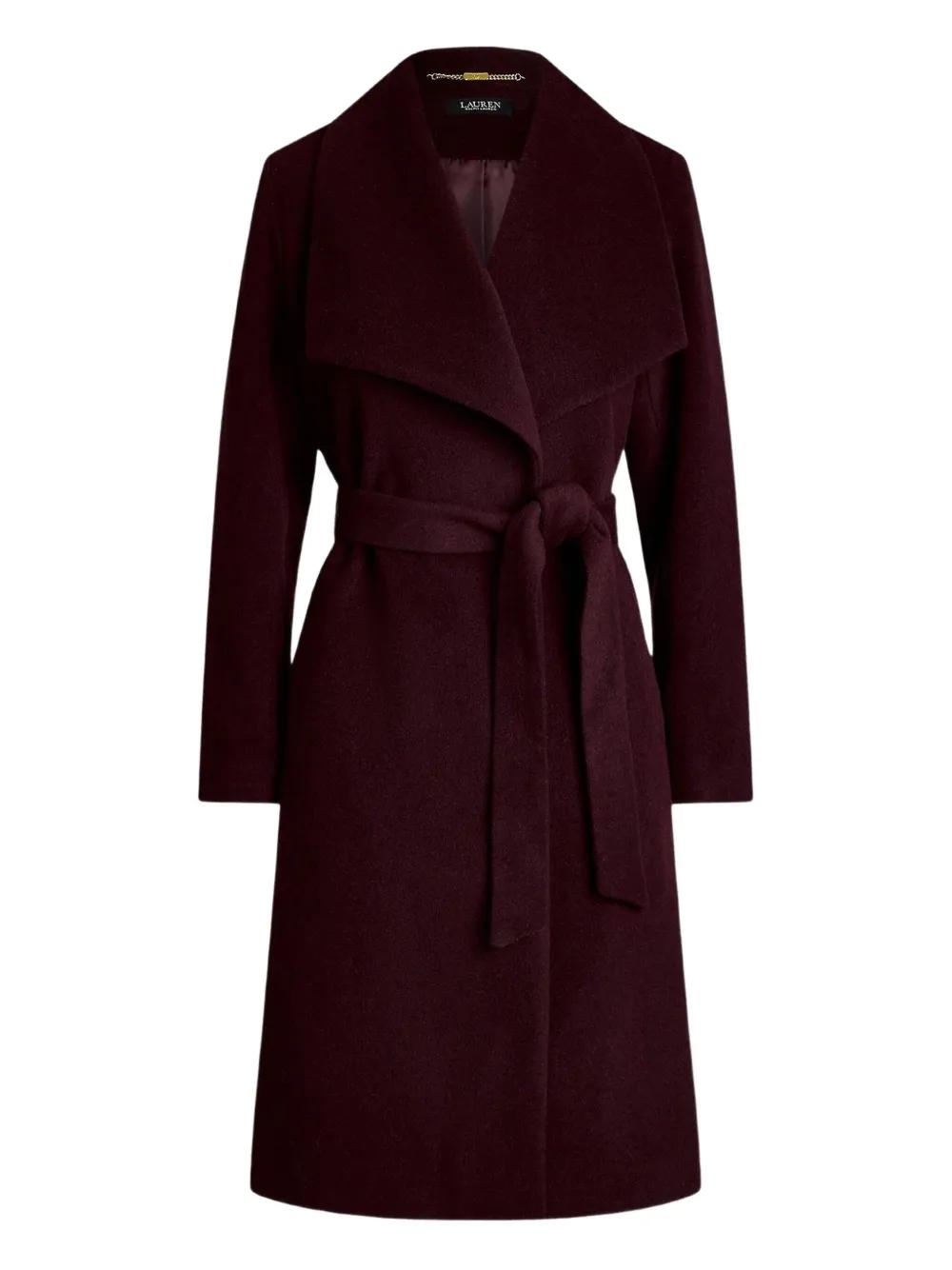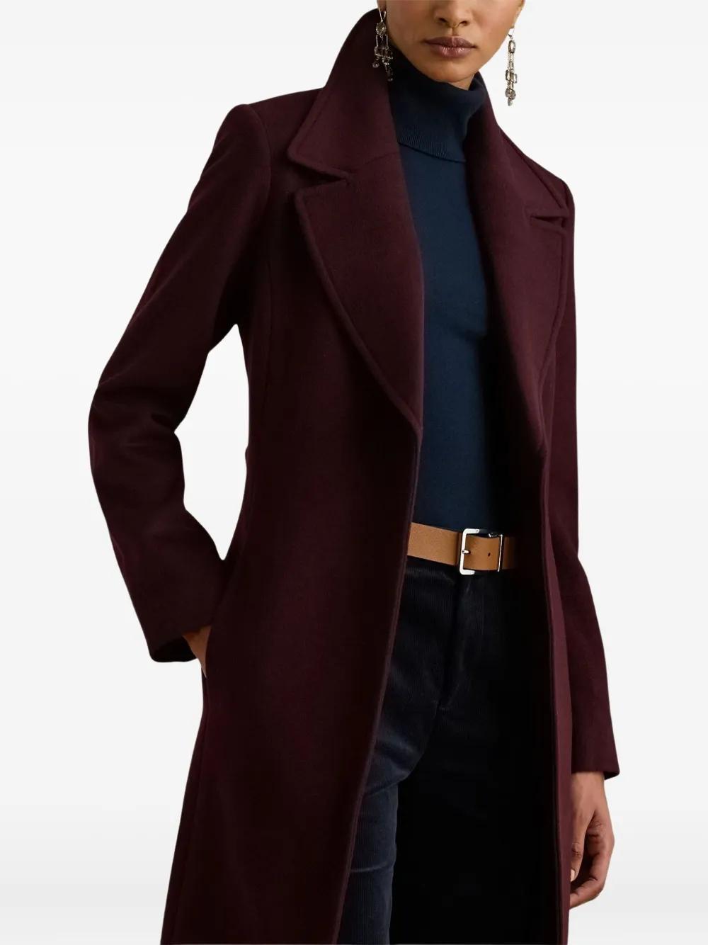 dark red wool-cashmere blend belted wide lapel long sleeves front welt pockets