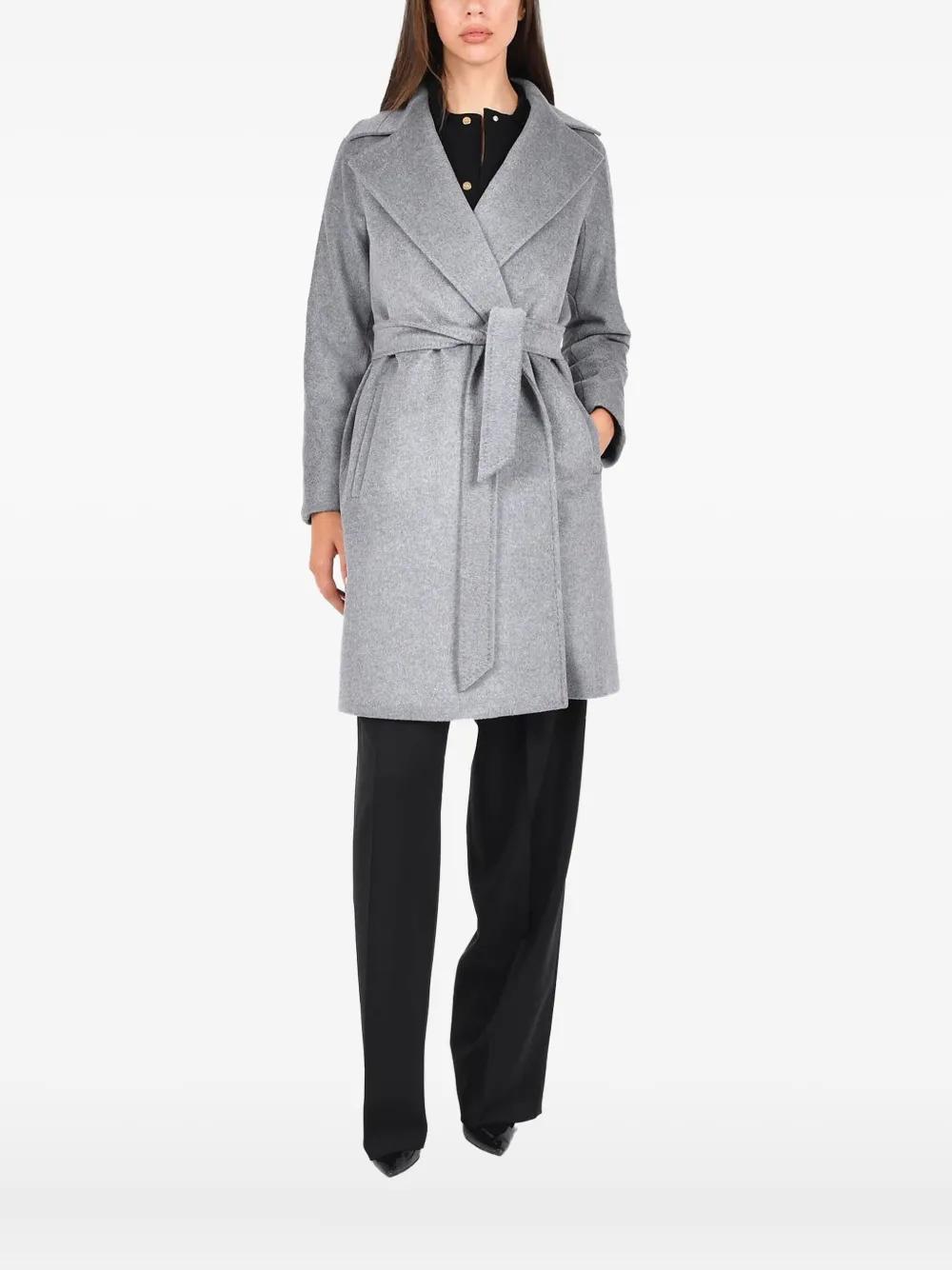 grey notched lapels belted front pockets long sleeves double-breasted closure