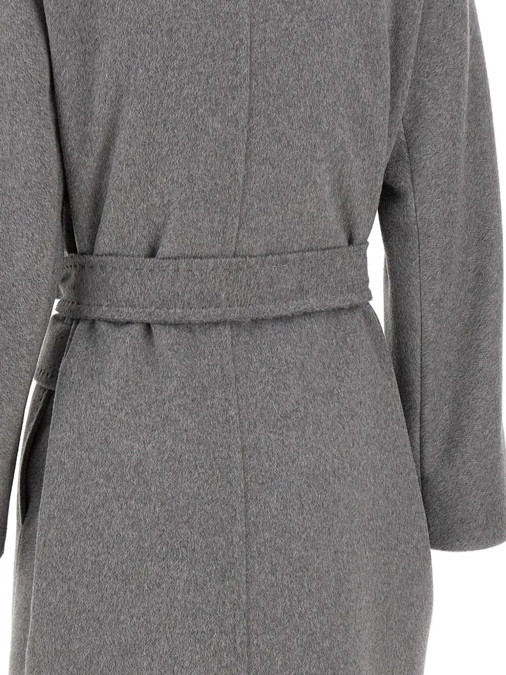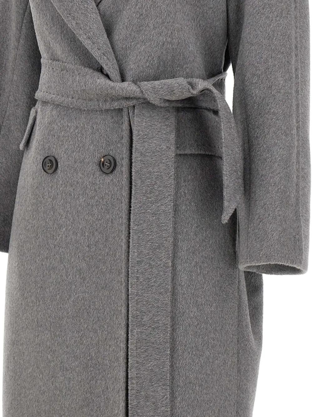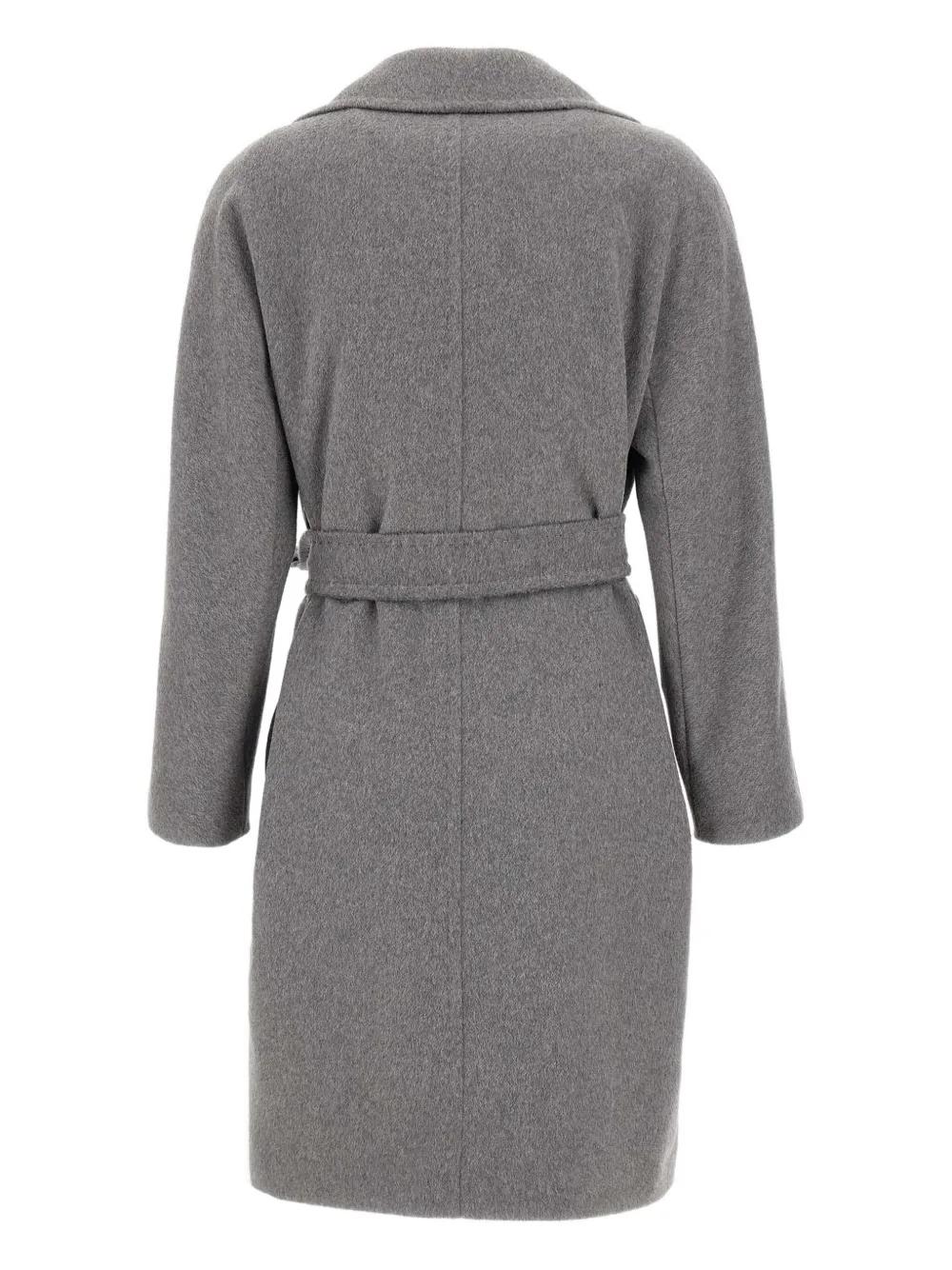 grey wool-alpaca-cashmere blend double-breasted closure contrasting buttons front flap pockets includes belt