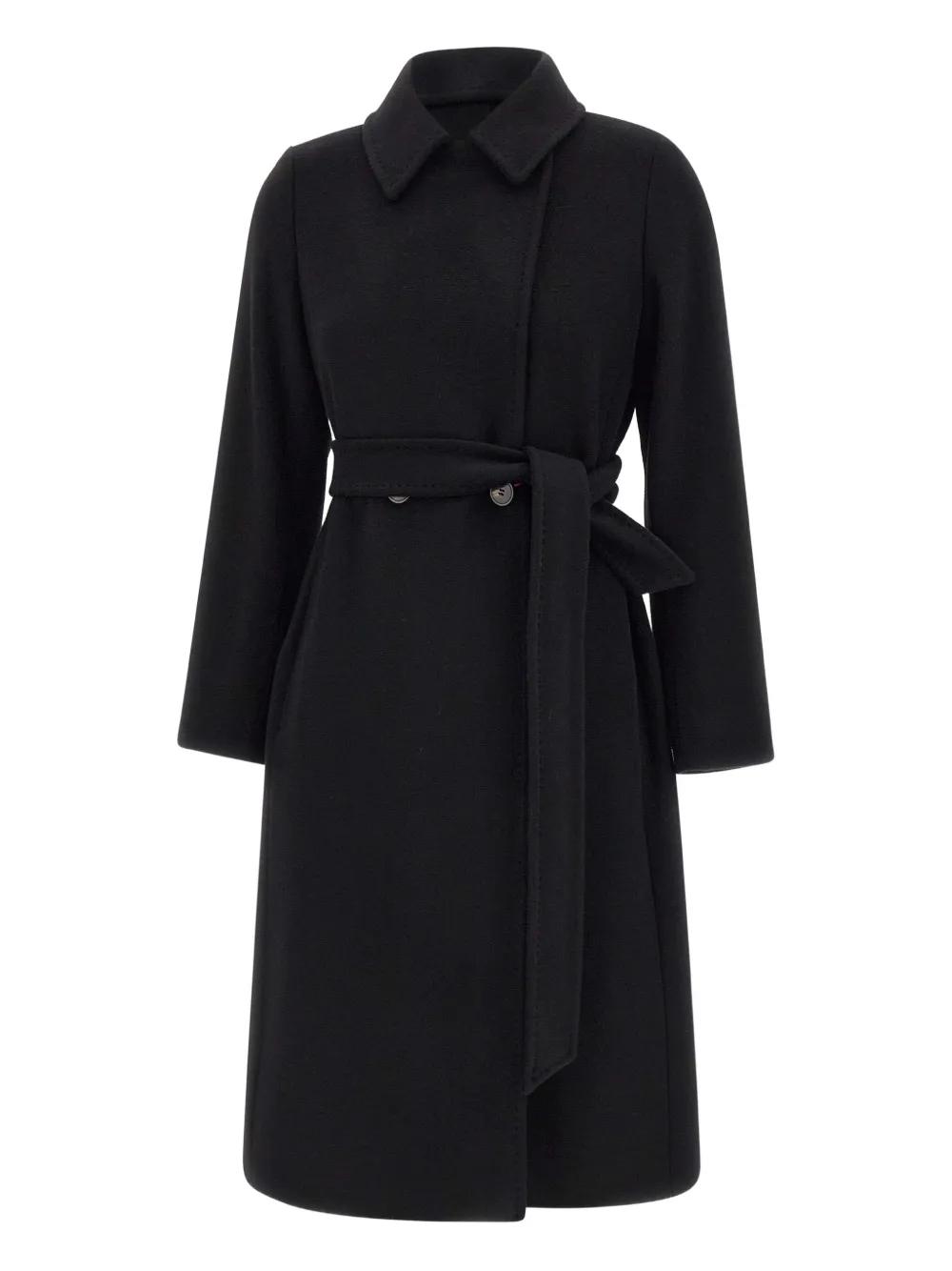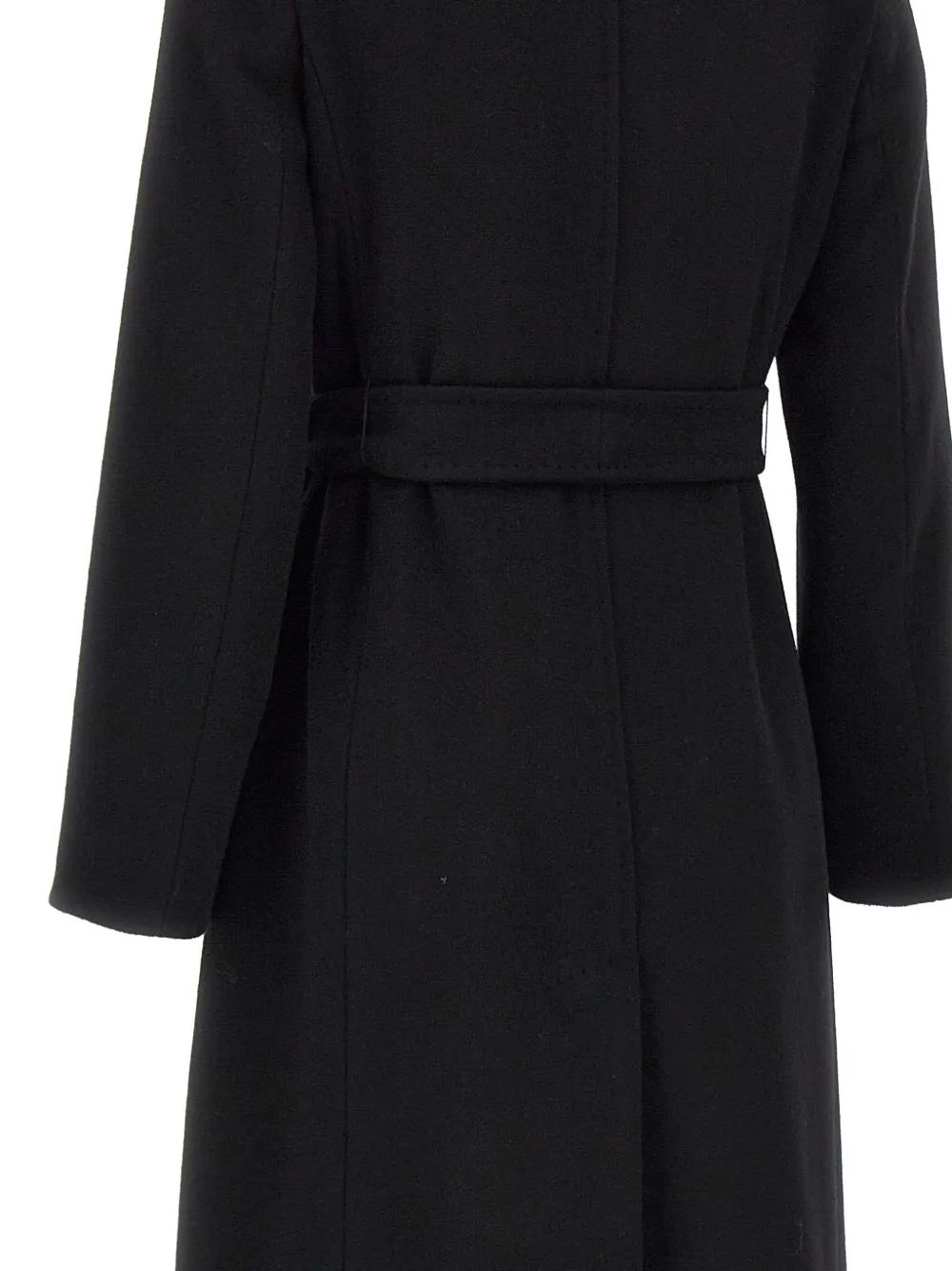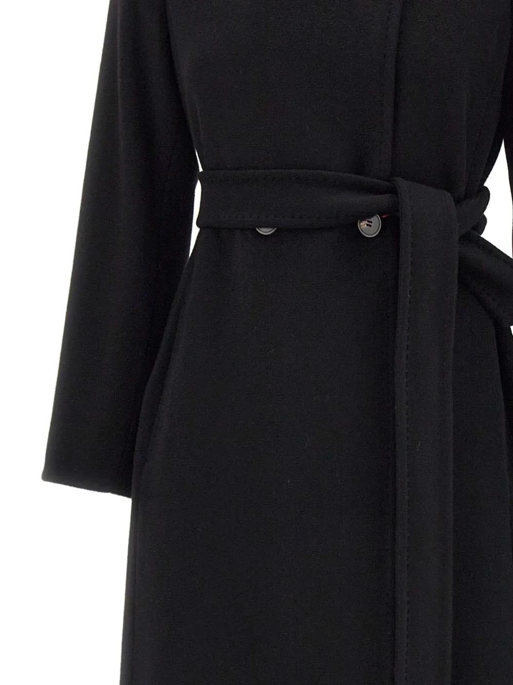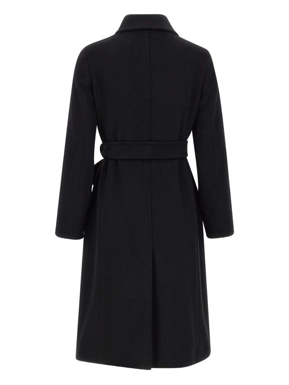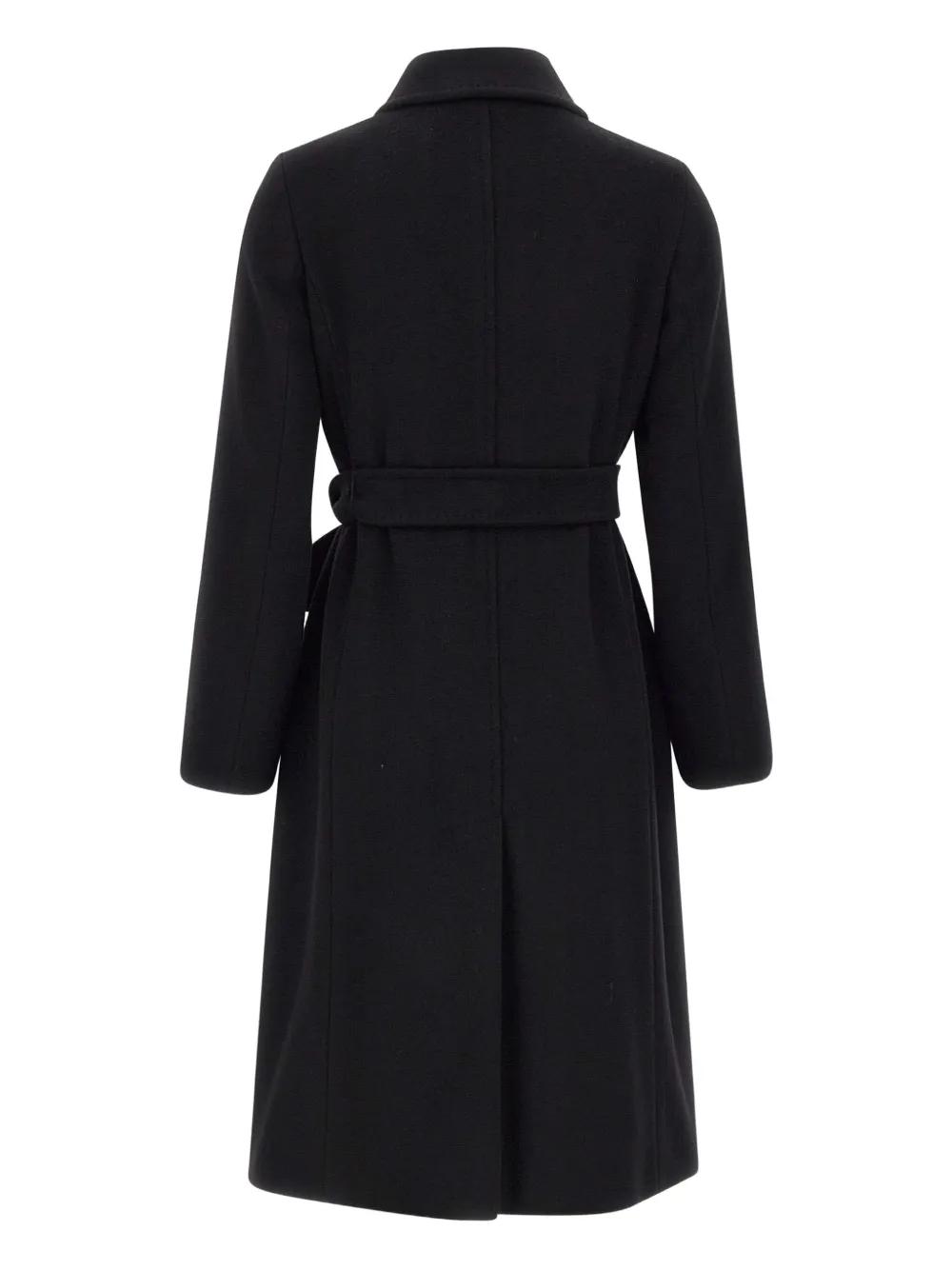 black double-breasted front four buttons side welt pockets tie belt back vent