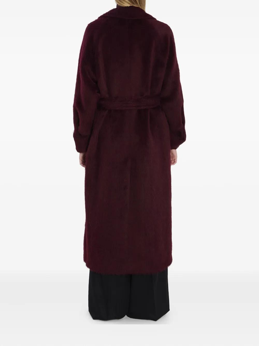 burgundy alpaca wool blend classic lapels removable belt flap pockets buttoned cuffs central back vent