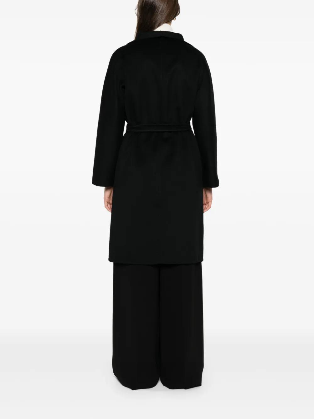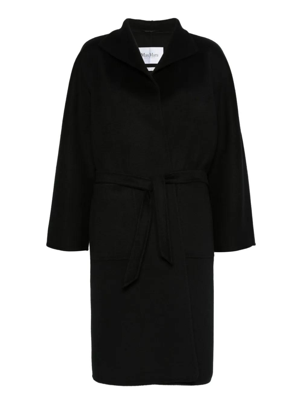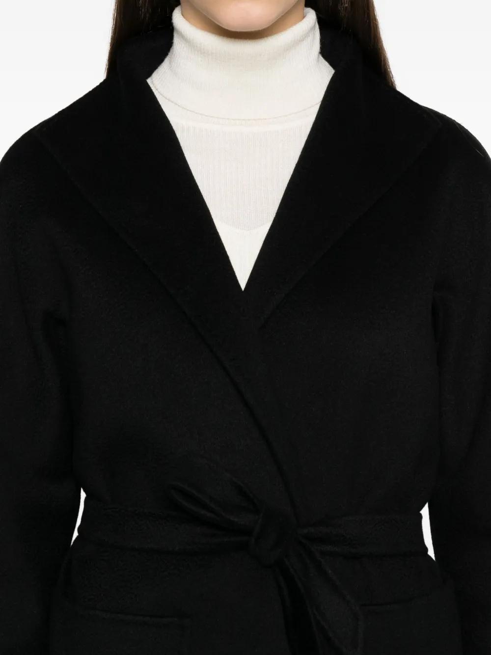 black double-breasted wrap style belted waist wide sleeves notched collar
