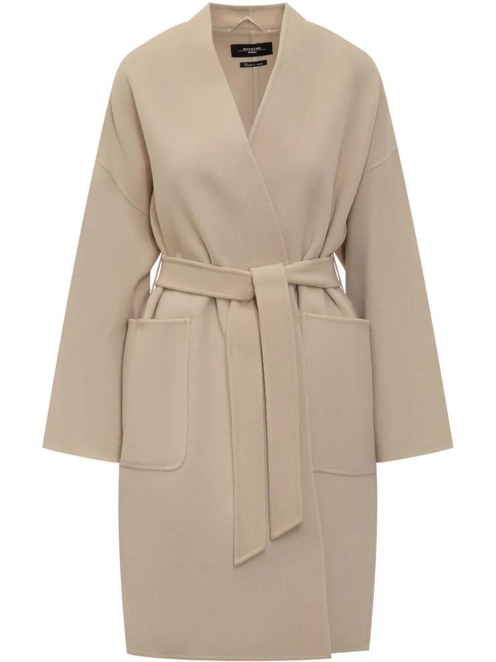 beige belted waist two side patch pockets drop shoulder long sleeves