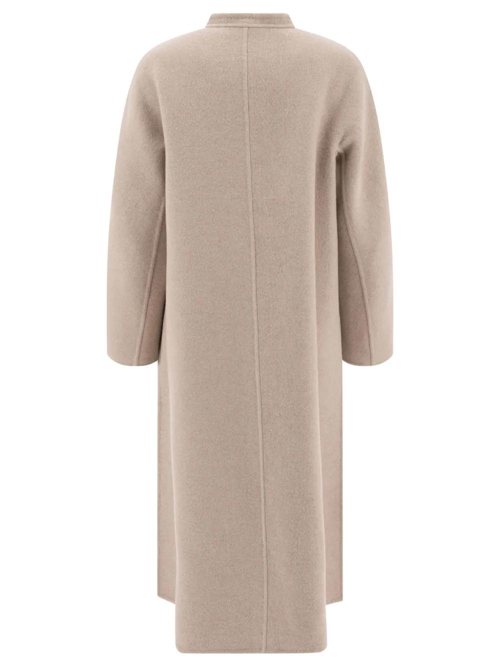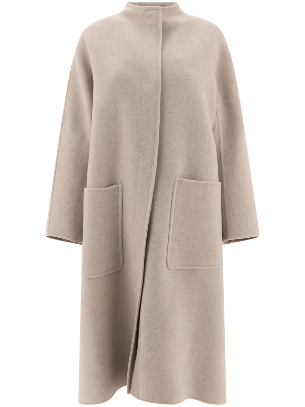 light beige concealed front fastening two side patch pockets side slits long sleeves
