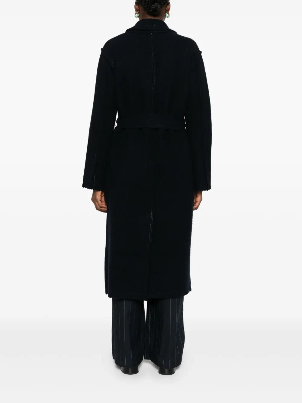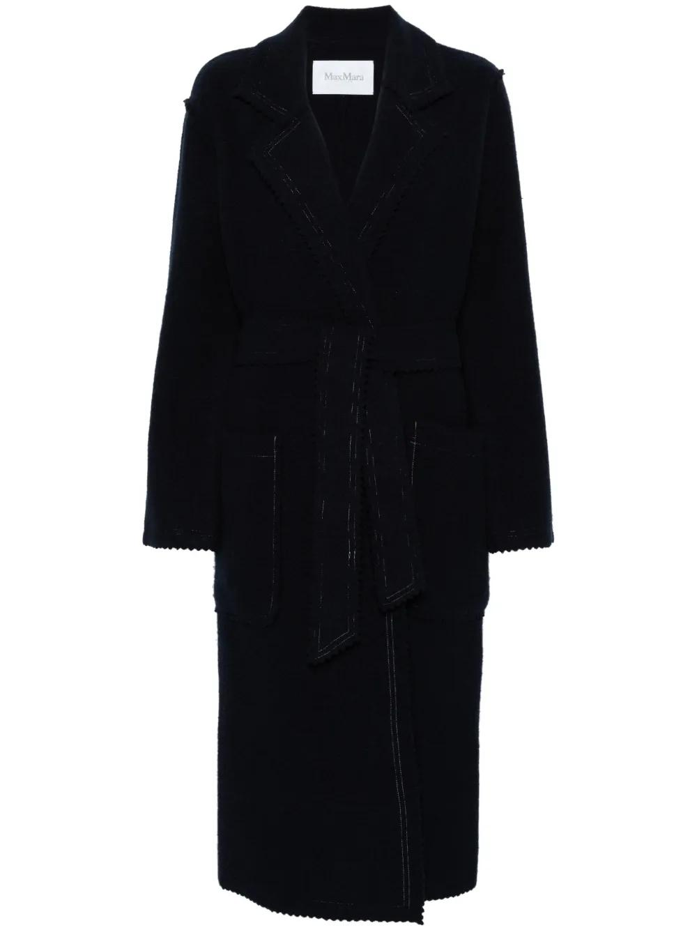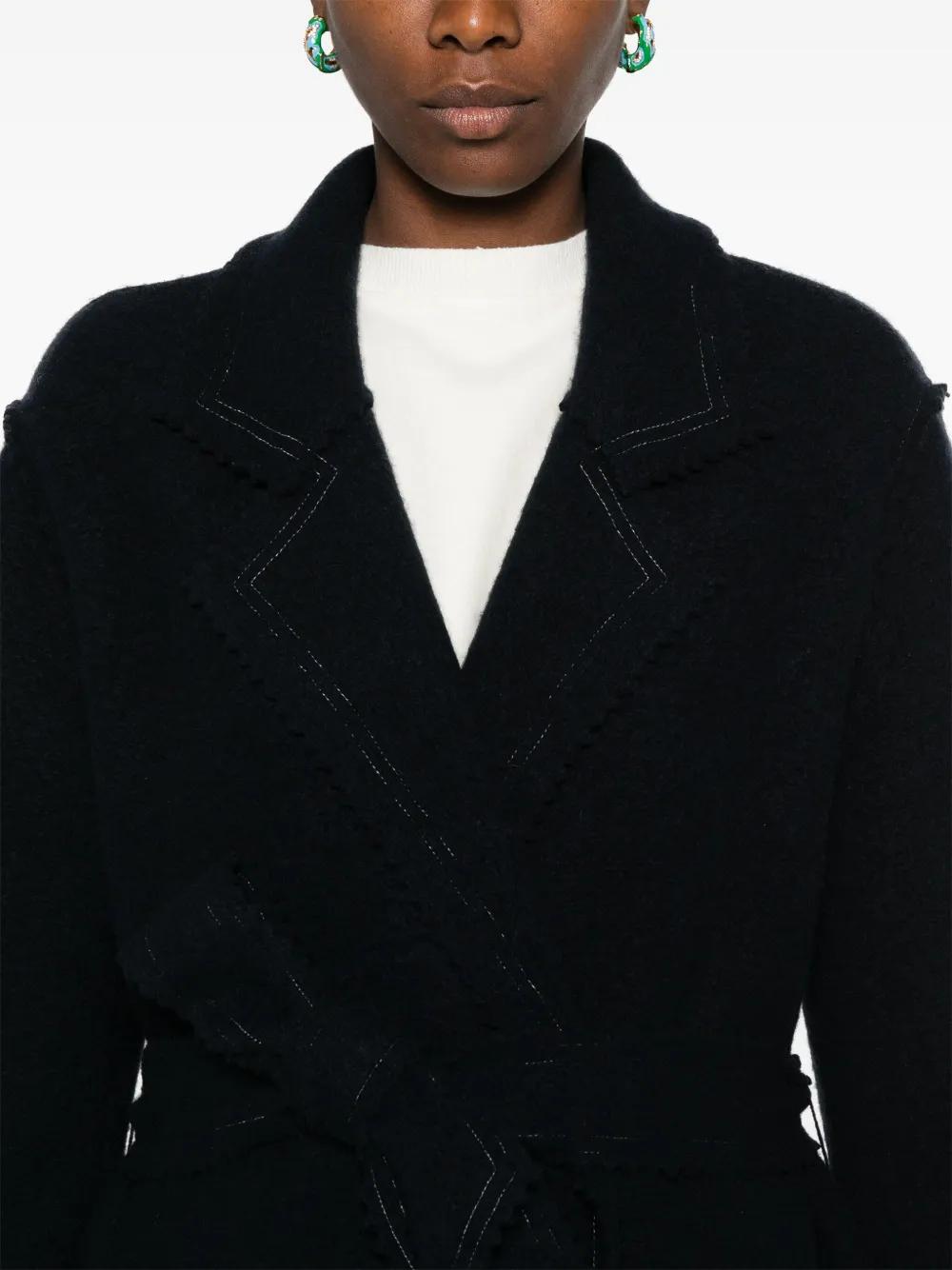 midnight blue wool-cashmere blend brushed effect scallop edge detachable waist belt notched lapels long sleeves two front patch pockets central rear vent straight hem