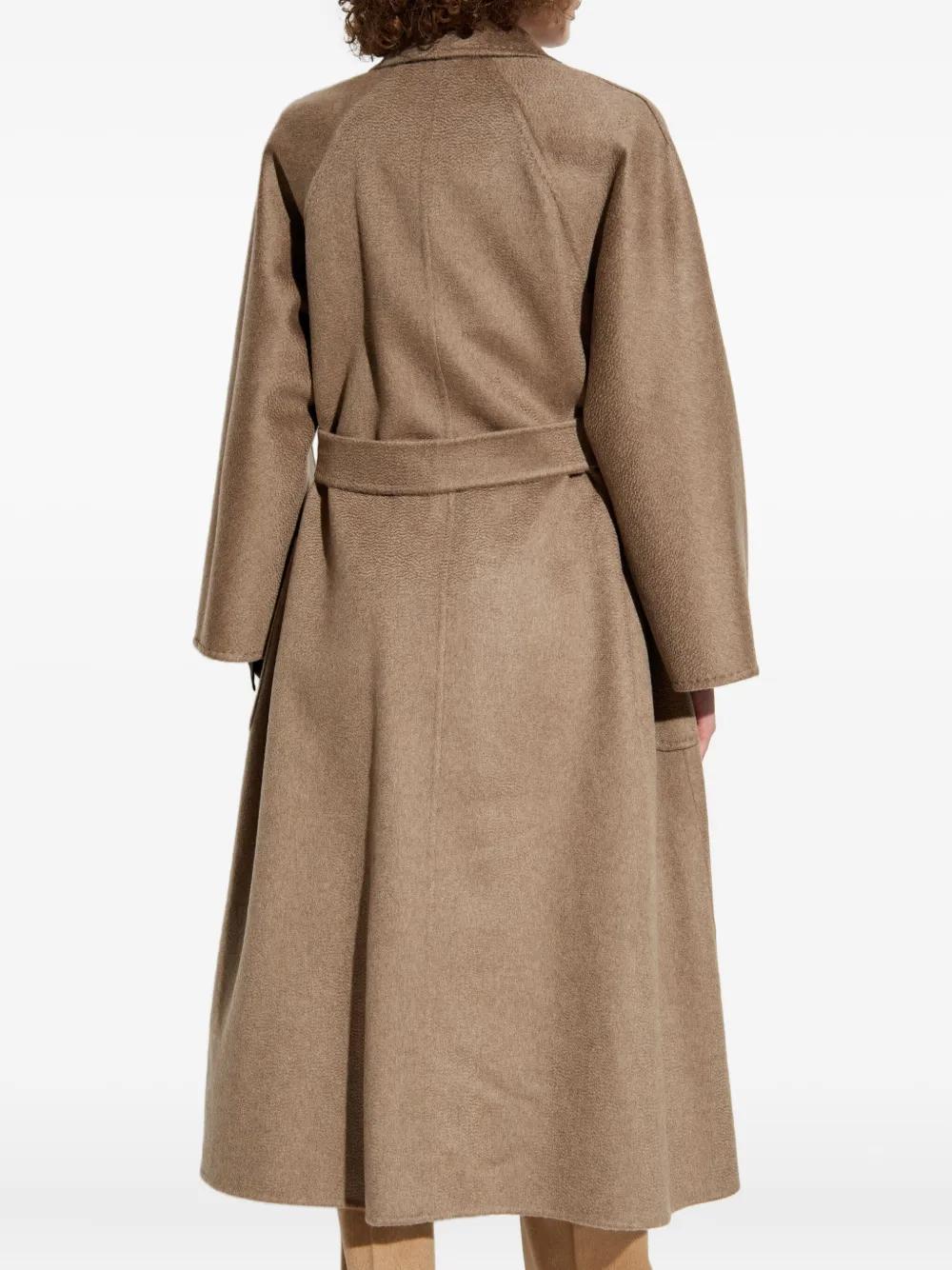 brown virgin wool hooded neckline welt pockets long sleeves self-tie belt