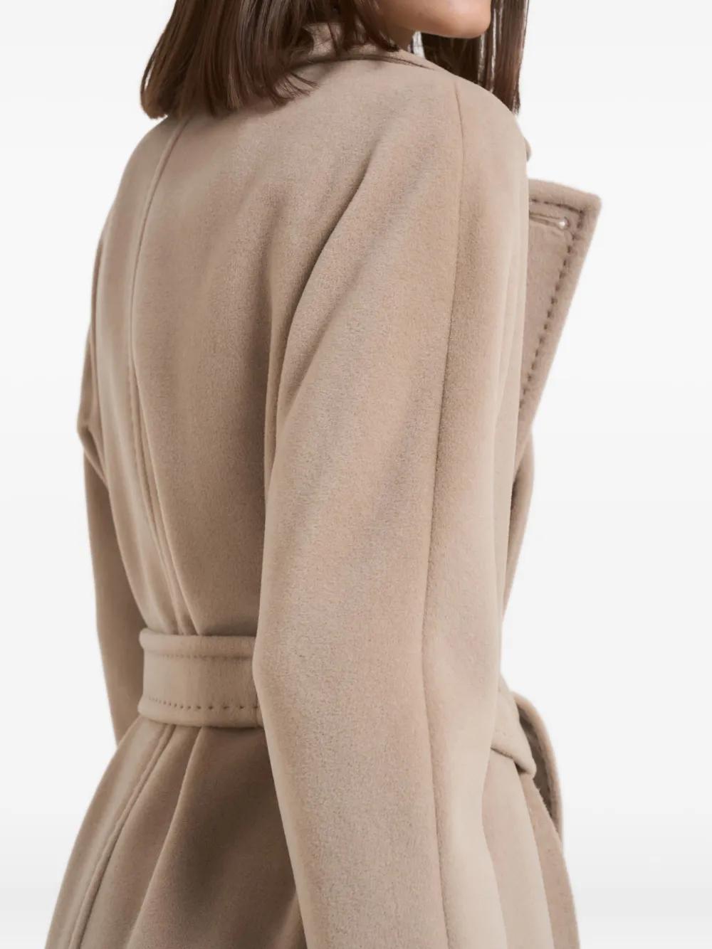 beige button and belted fastening notched lapels long sleeves welt pockets