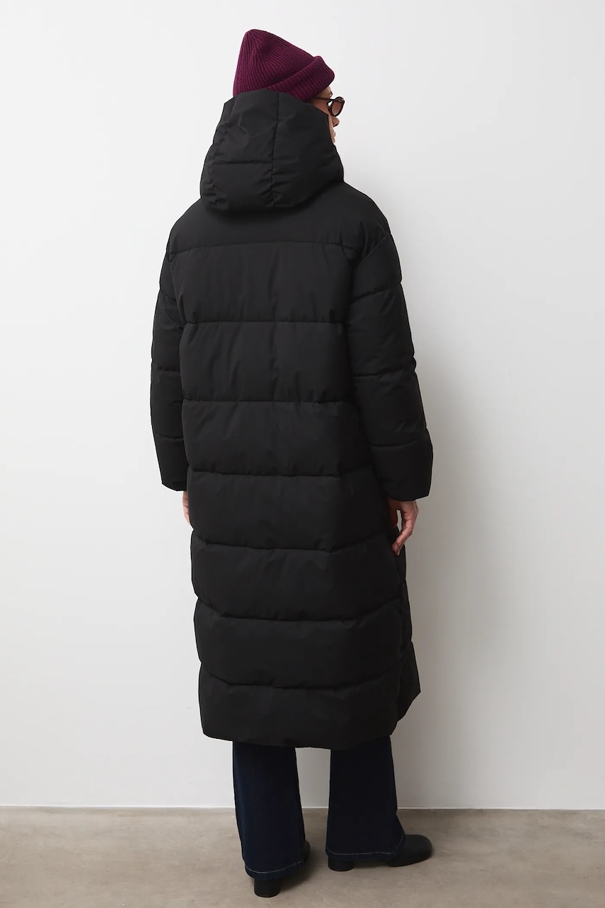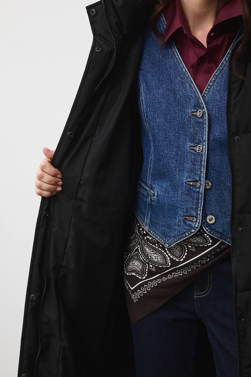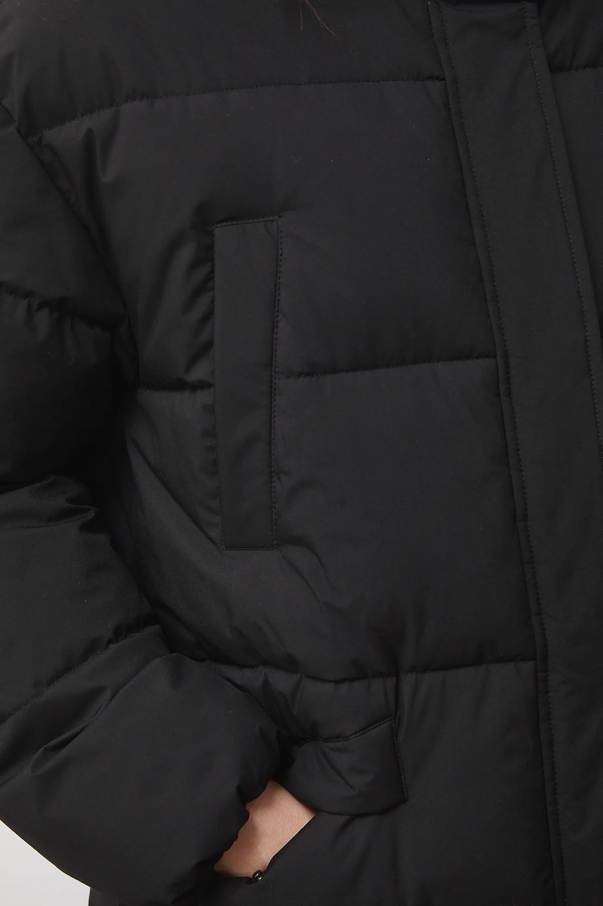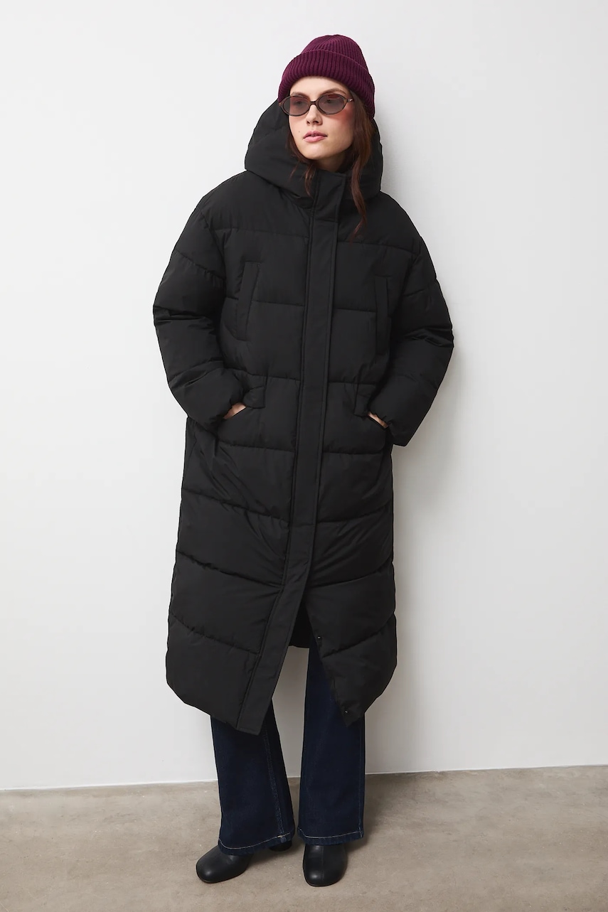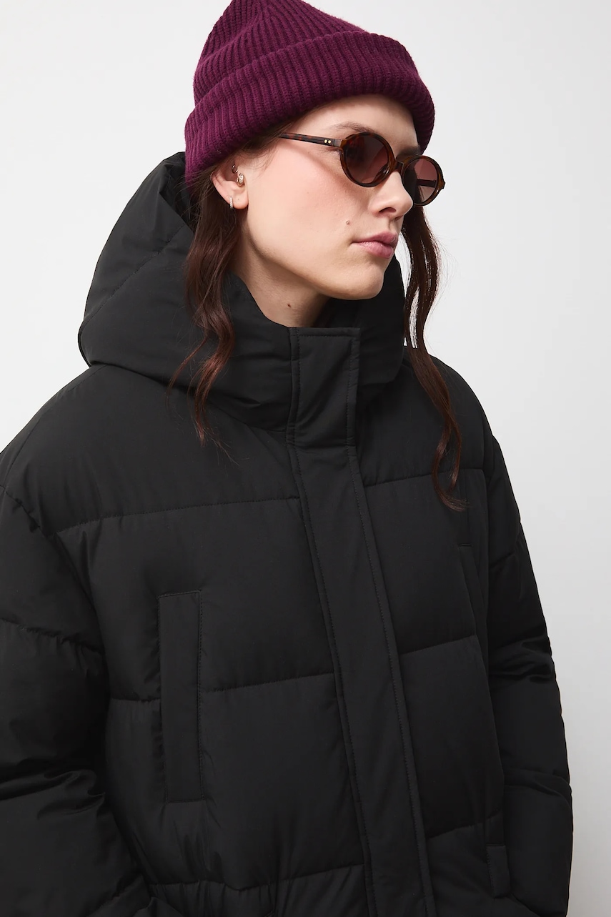 - Fason oversize. - Zapięcie na suwak i zatrzaski. - Podwyższony kołnierz. - Model z kapturem. - Wsuwane kieszenie. - Ocieplony model na podszewce. - Pikowany model. - Długość rękawa: 57,5 cm. - Długość: 124 cm. - Szerokość w biuście: 62 cm. - Wymiary podane dla rozmiaru: S.