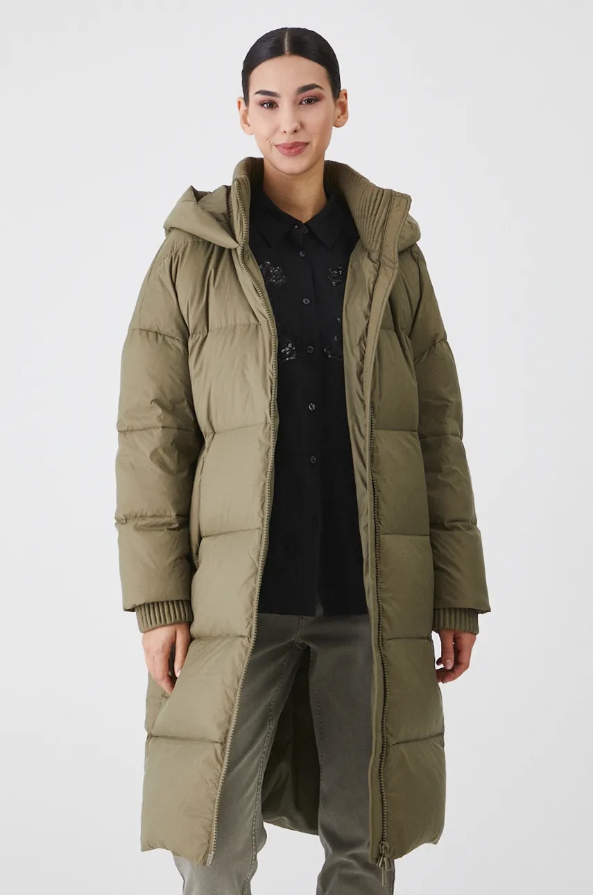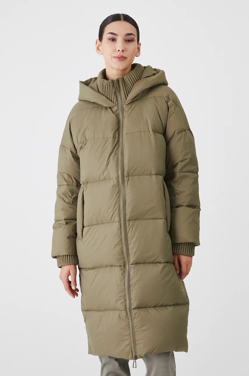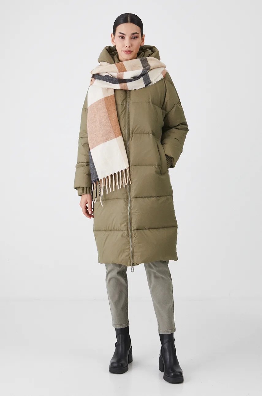 - Fason oversize. - Długi rękaw. - Obniżona linia ramion. - Rękawy wykończone ściągaczem. - Podwyższony kołnierz ze ściągaczem. - Model z kapturem. - Dwie wsuwane kieszenie boczne. - Zapięcie na dwustronny suwak. - Ocieplony model na podszewce. - Wypełnienie z naturalnego puchu i pierza. - Pikowany model. - Długość rękawa(mierzona od kaptura): 73 cm. - Długość: 103,5 cm. - Szerokość w biuście: 62 cm. - Wymiary podane dla rozmiaru: S.