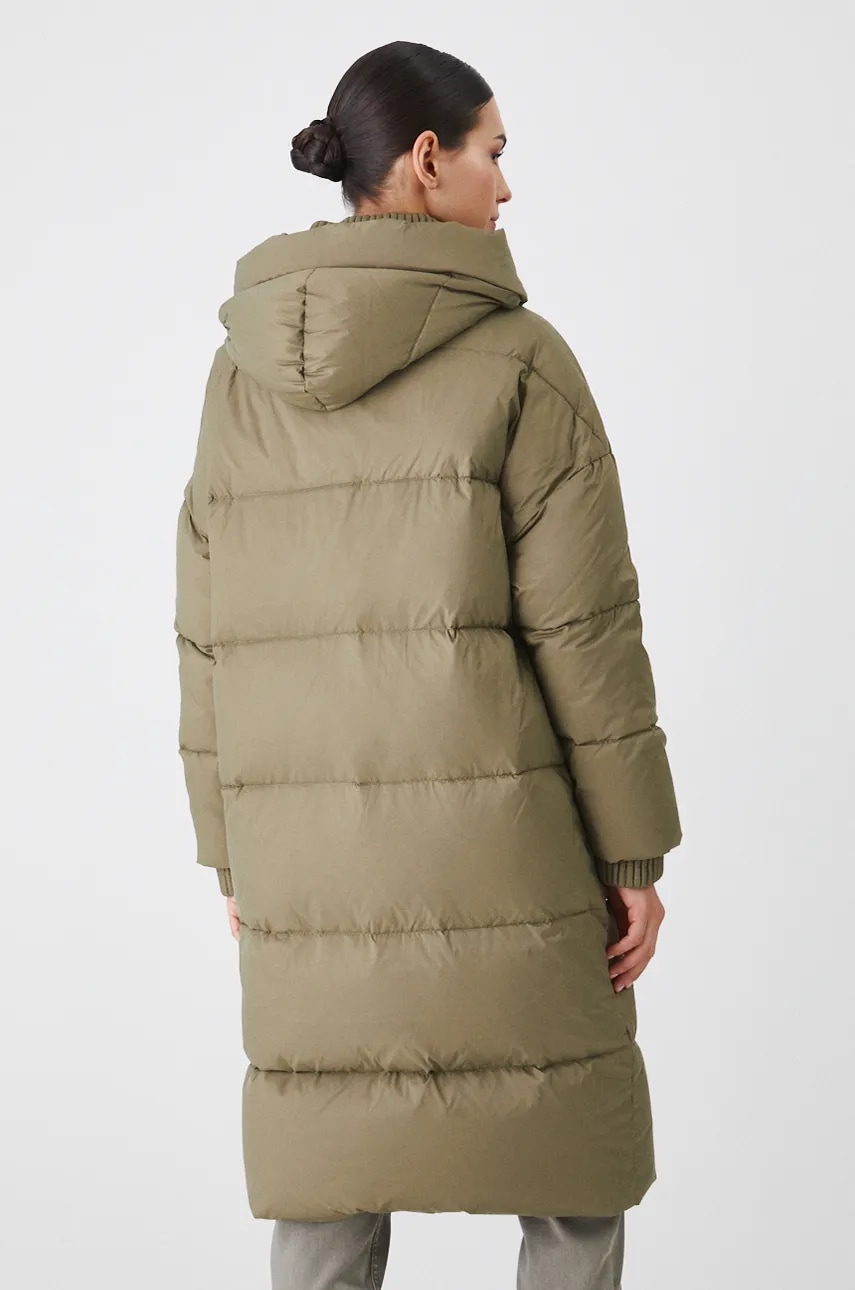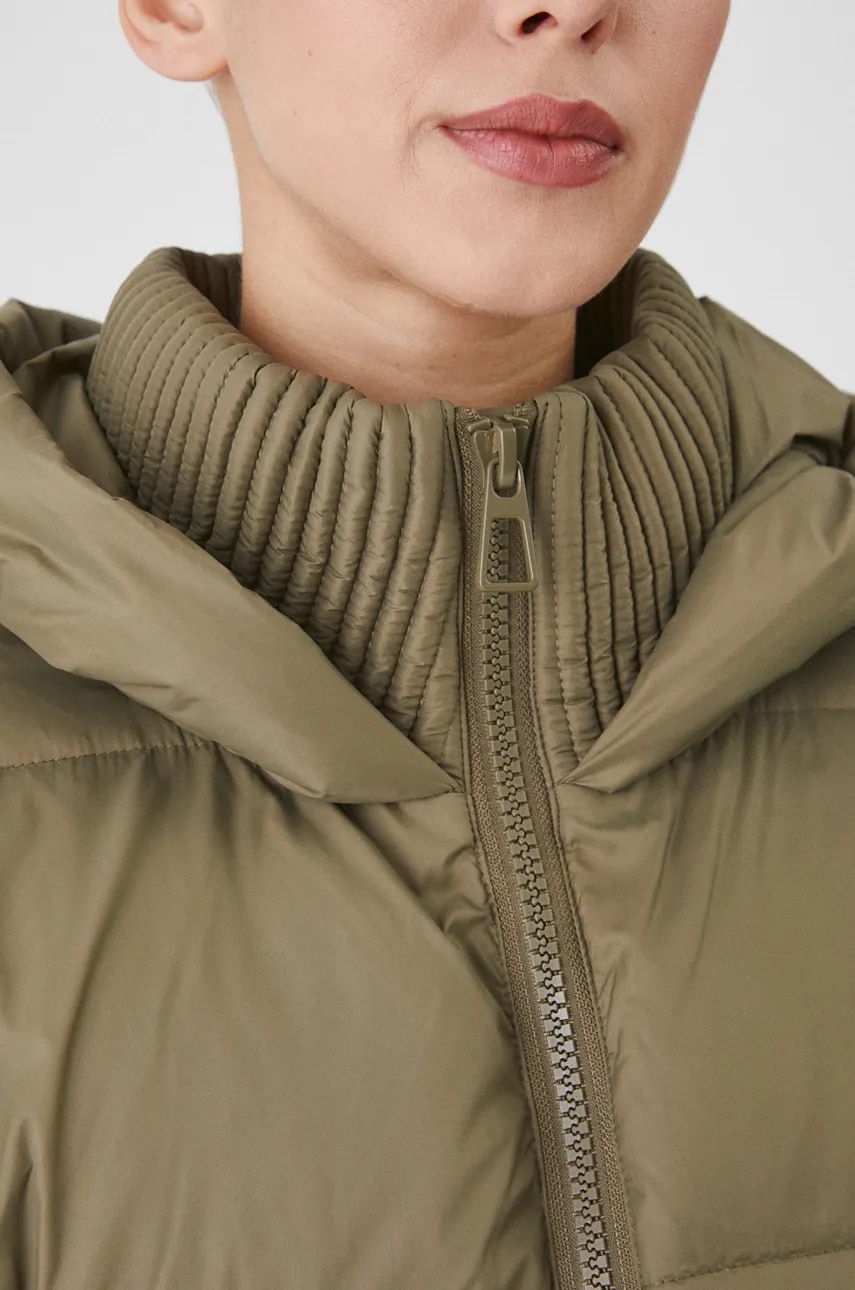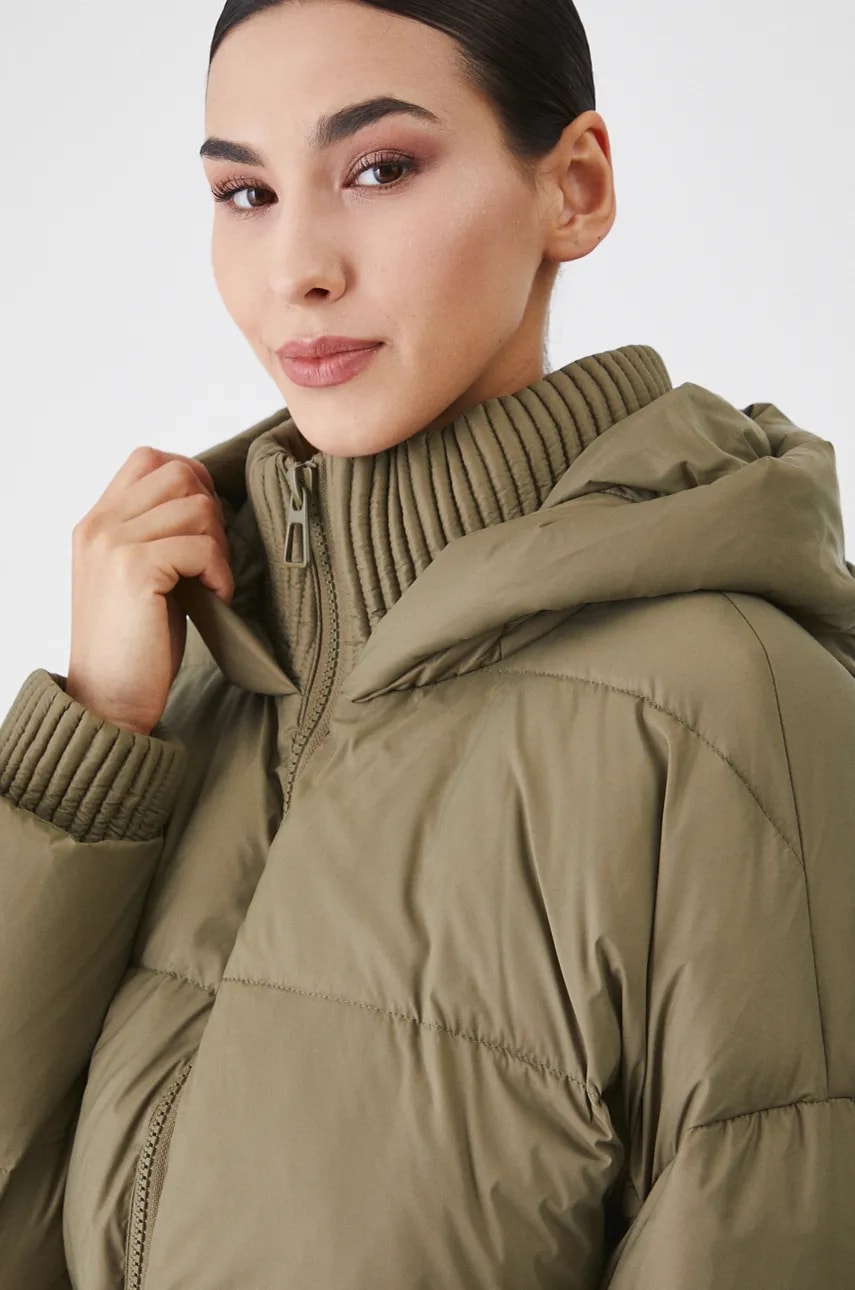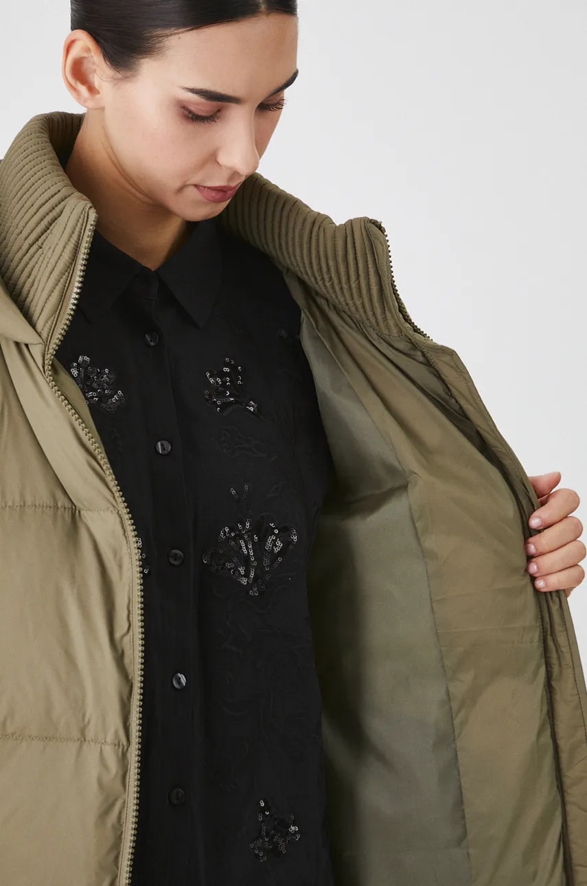 - Fason oversize. - Długi rękaw. - Obniżona linia ramion. - Rękawy wykończone ściągaczem. - Podwyższony kołnierz ze ściągaczem. - Model z kapturem. - Dwie wsuwane kieszenie boczne. - Zapięcie na dwustronny suwak. - Ocieplony model na podszewce. - Wypełnienie z naturalnego puchu i pierza. - Pikowany model. - Długość rękawa(mierzona od kaptura): 73 cm. - Długość: 103,5 cm. - Szerokość w biuście: 62 cm. - Wymiary podane dla rozmiaru: S.