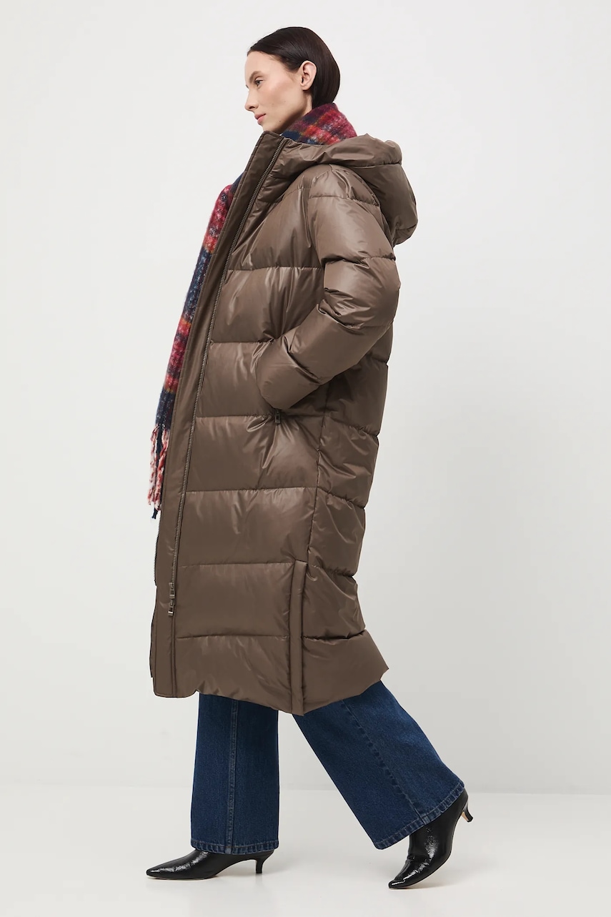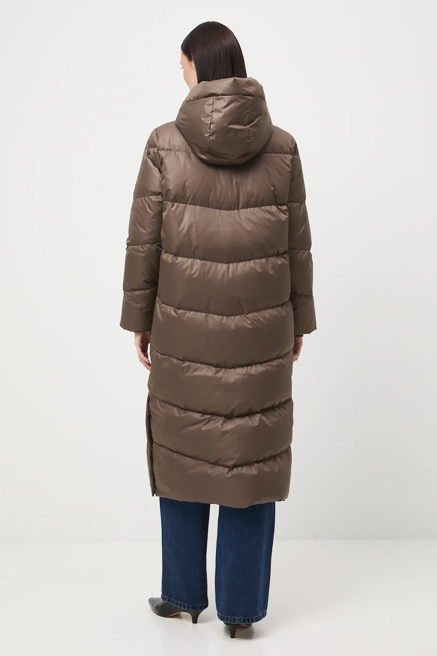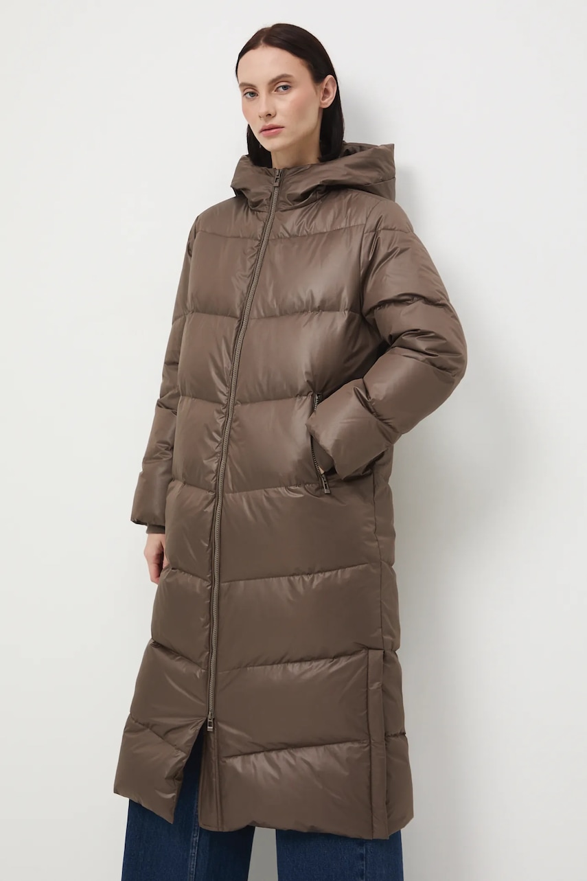 - Fason oversize. - Długi rękaw. - Rękawy wykończone ściągaczem. - Podwyższony kołnierz. - Model z kapturem. - Zapięcie na dwustronny suwak. - Dwie wsuwane i zapinane na suwak kieszenie boczne. - Po bokach rozcięcia zapinane na zatrzaski. - Ocieplony model na podszewce. - Wypełnienie z naturalnego puchu i pierza. - Pikowany model. - Długość rękawa: 65 cm. - Długość: 122 cm. - Szerokość w biuście: 62 cm. - Szerokość w barkach: 45 cm. - Wymiary podane dla rozmiaru: S.