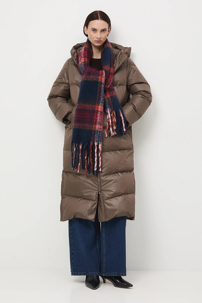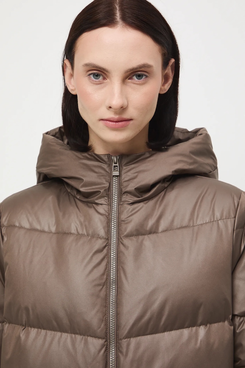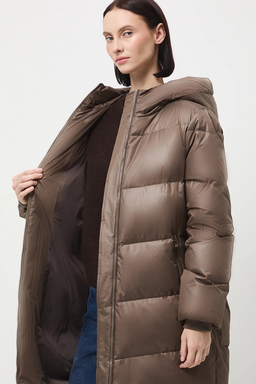 - Fason oversize. - Długi rękaw. - Rękawy wykończone ściągaczem. - Podwyższony kołnierz. - Model z kapturem. - Zapięcie na dwustronny suwak. - Dwie wsuwane i zapinane na suwak kieszenie boczne. - Po bokach rozcięcia zapinane na zatrzaski. - Ocieplony model na podszewce. - Wypełnienie z naturalnego puchu i pierza. - Pikowany model. - Długość rękawa: 65 cm. - Długość: 122 cm. - Szerokość w biuście: 62 cm. - Szerokość w barkach: 45 cm. - Wymiary podane dla rozmiaru: S.