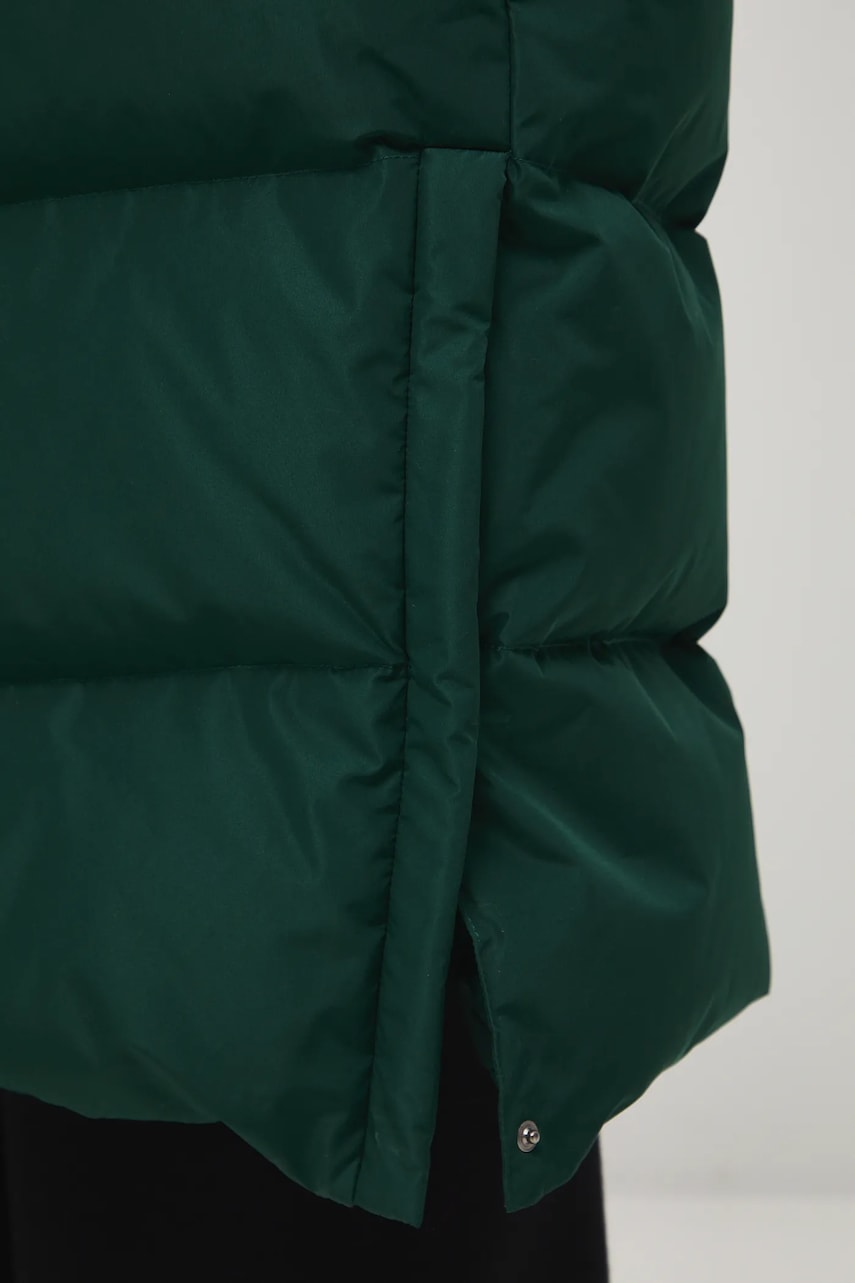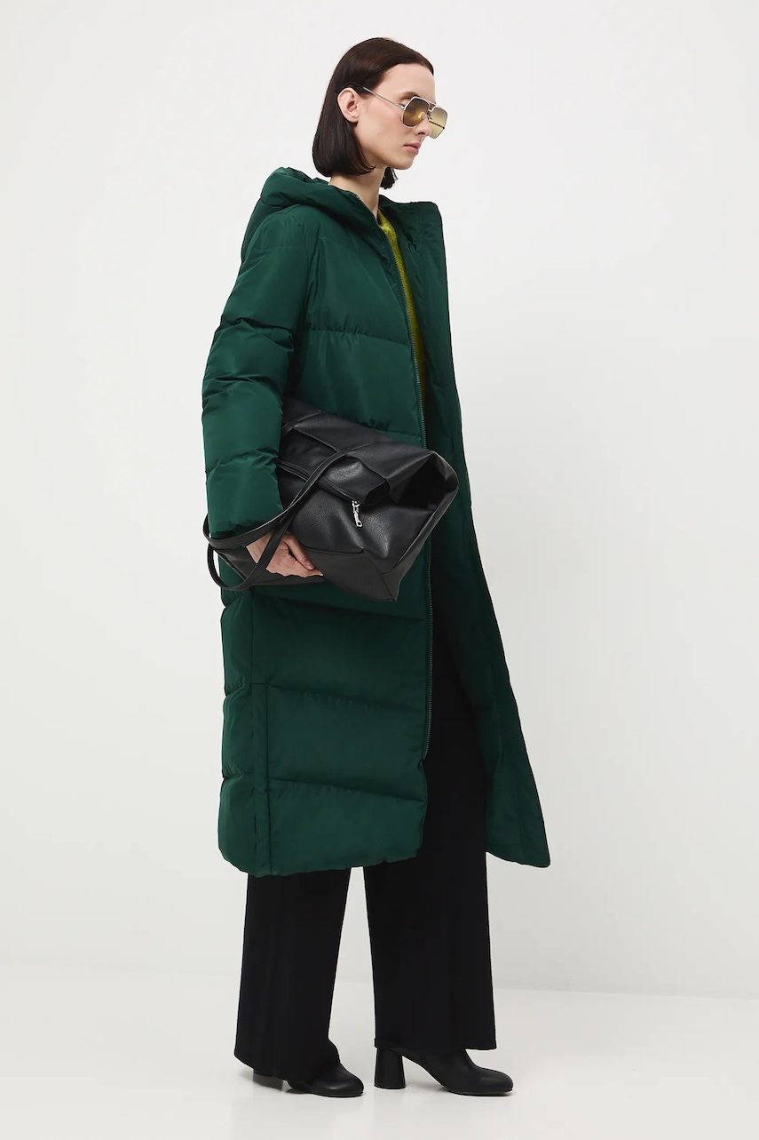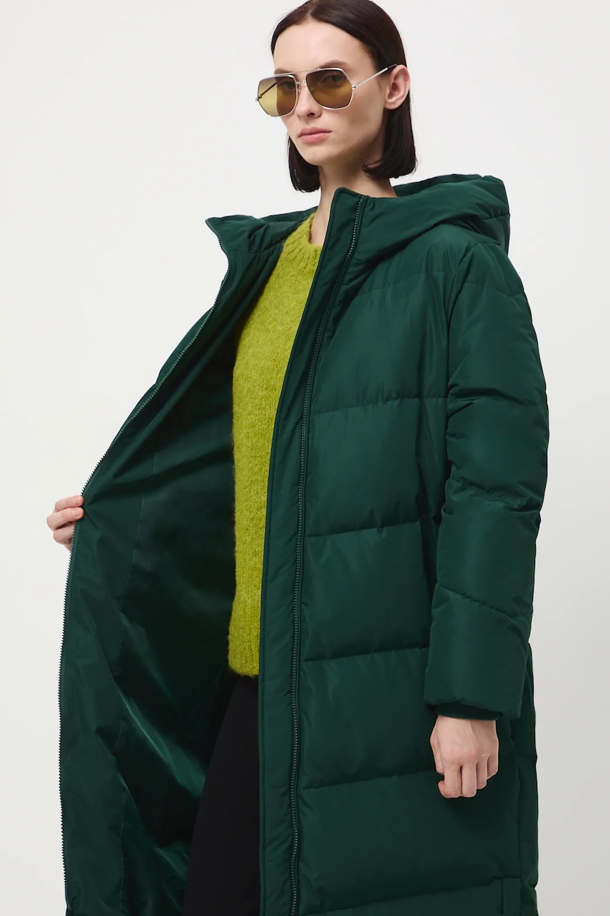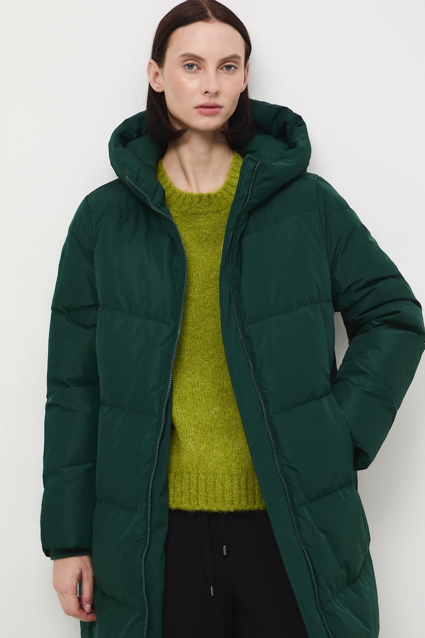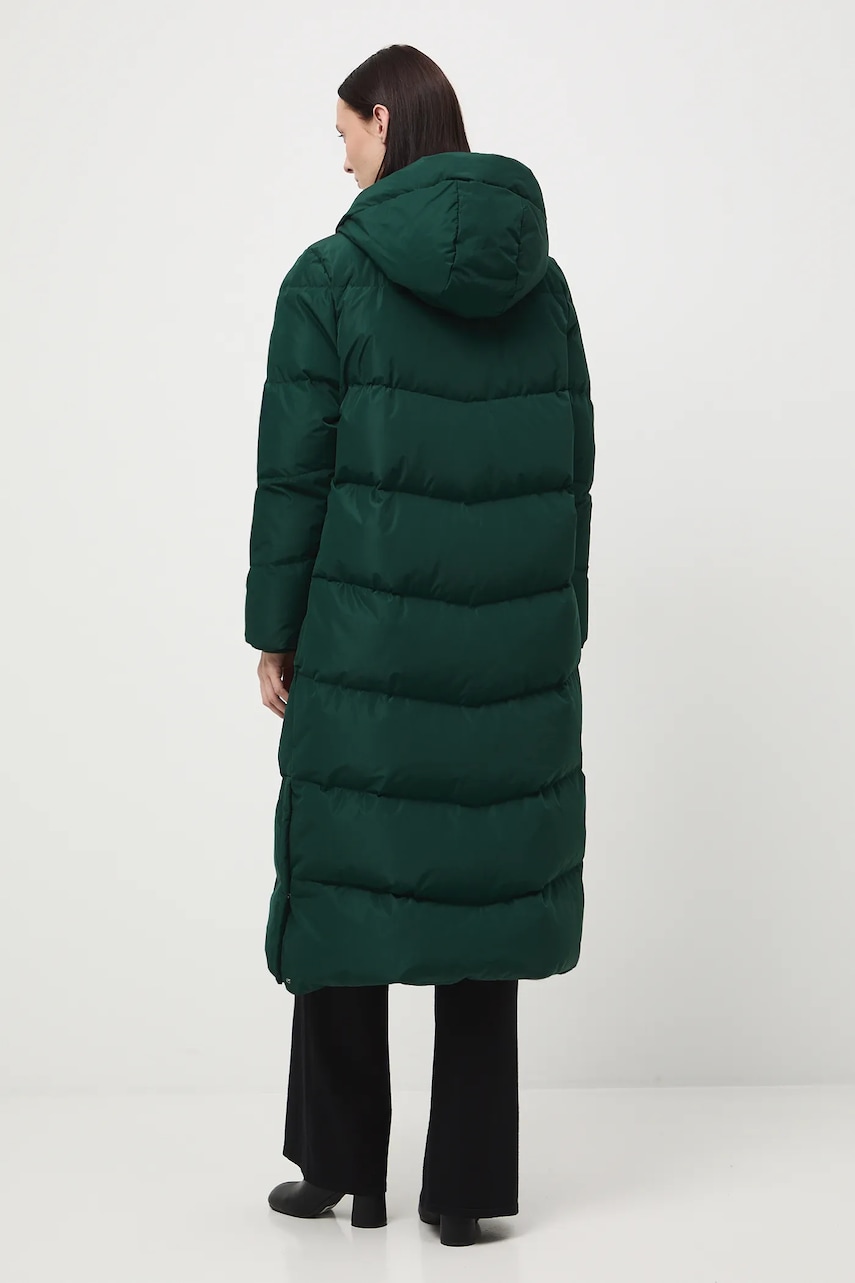 - Fason oversize. - Długi rękaw. - Rękawy wykończone ściągaczem. - Podwyższony kołnierz. - Model z kapturem. - Zapięcie na dwustronny suwak. - Dwie wsuwane i zapinane na suwak kieszenie boczne. - Po bokach rozcięcia zapinane na zatrzaski. - Ocieplony model na podszewce. - Wypełnienie z naturalnego puchu i pierza. - Pikowany model. - Długość rękawa: 65 cm. - Długość: 122 cm. - Szerokość w biuście: 62 cm. - Szerokość w barkach: 45 cm. - Wymiary podane dla rozmiaru: S.