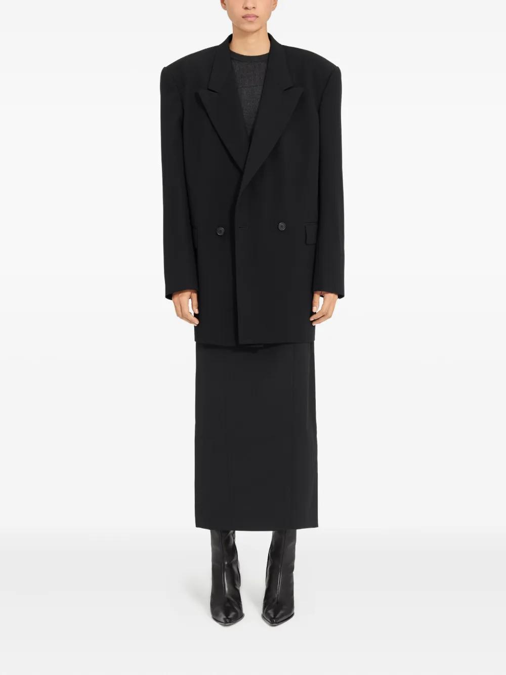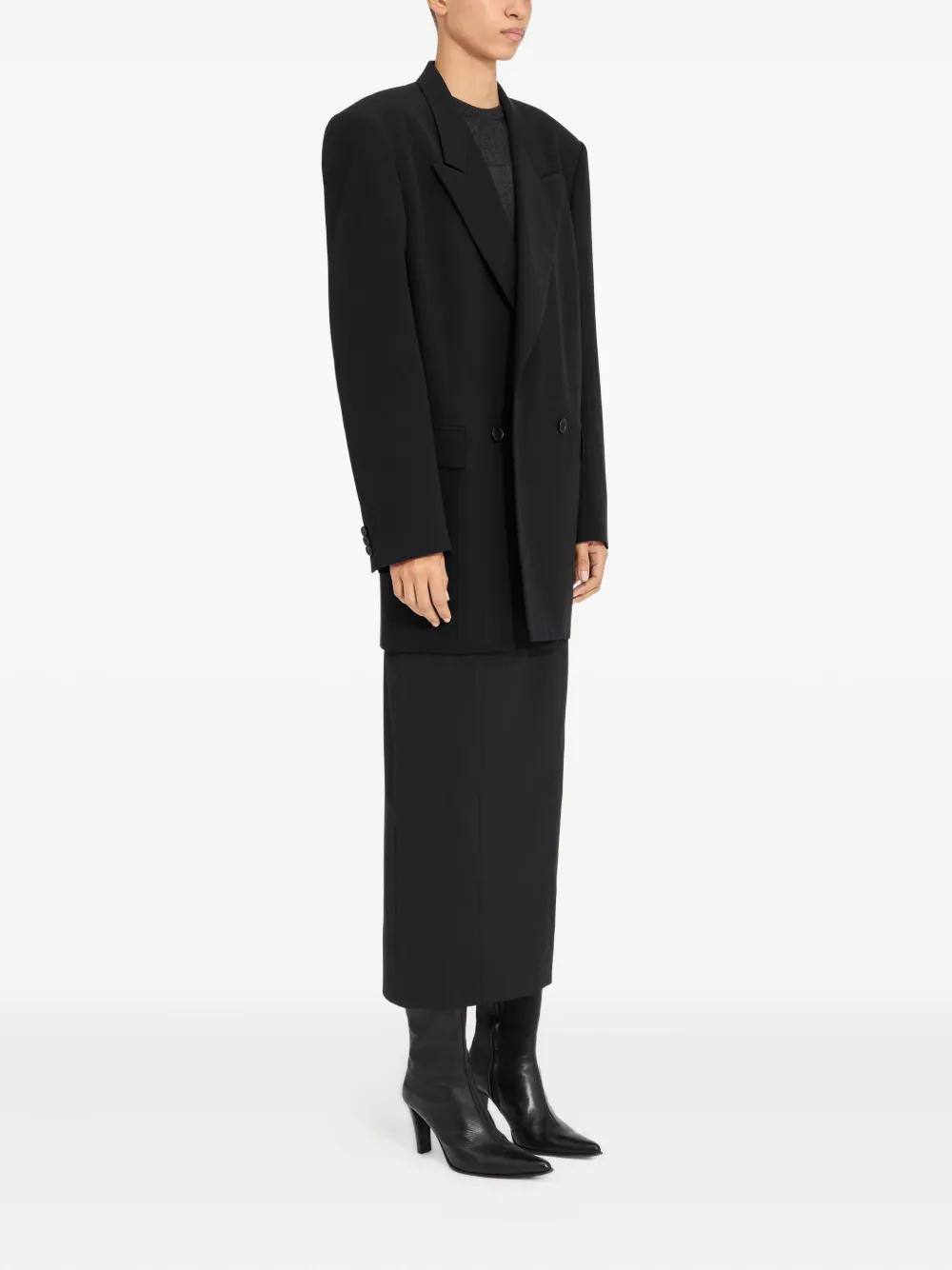 black double-breasted button fastening padded shoulders peak lapels long sleeves straight hem