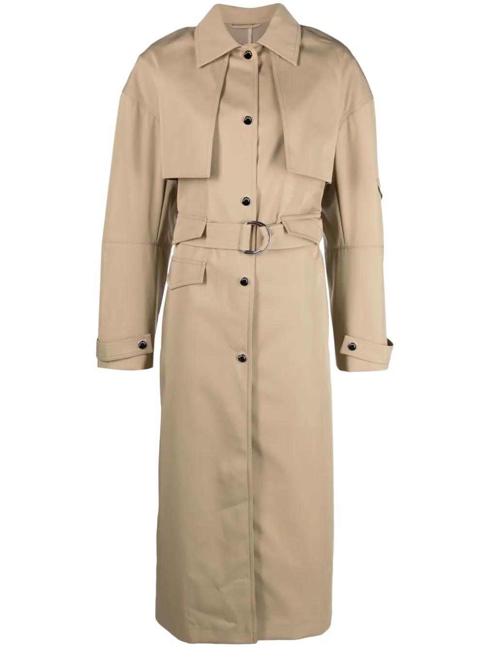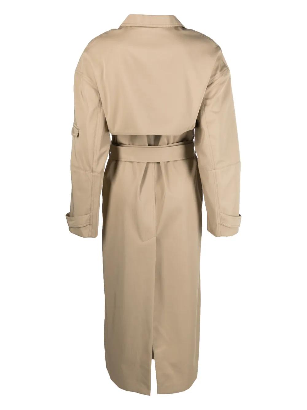 beige organic cotton epaulettes classic collar front press-stud fastening long sleeves sleeve flap pocket press-stud fastening cuffs detachable waist belt three side flap pockets rear slit calf-length straight hem