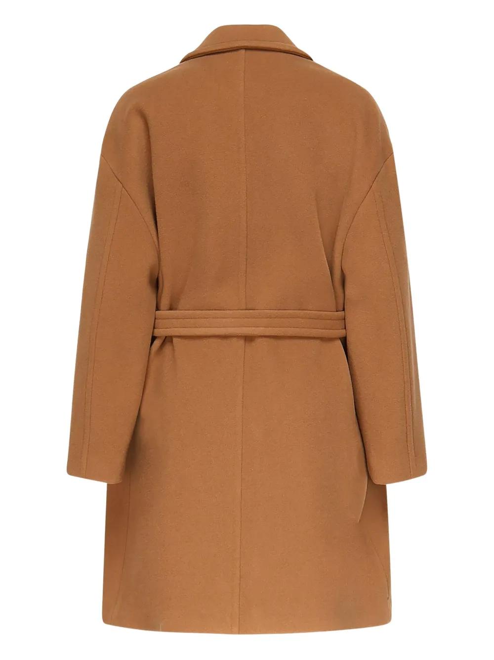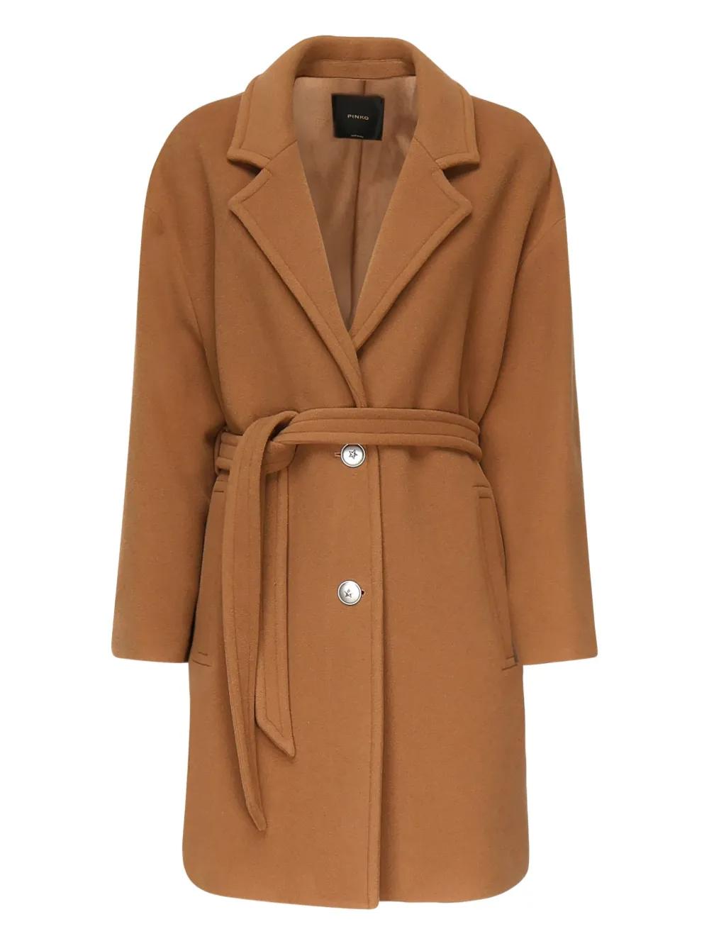 brown lapel collar self-tie belt button fastening welt pockets long sleeves