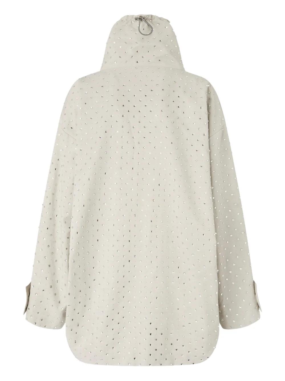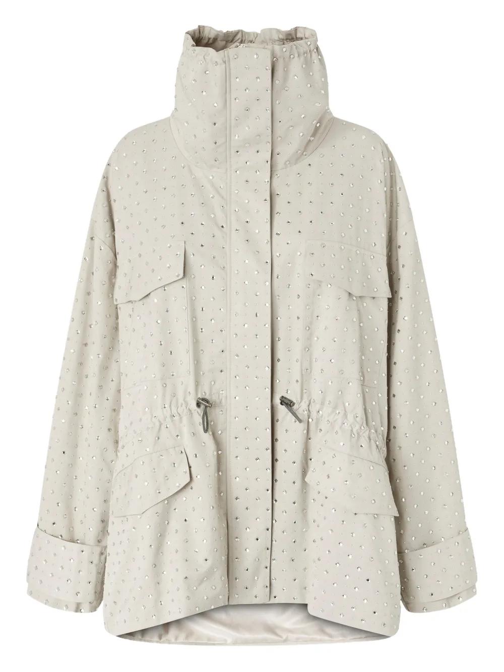light grey crystal embellishments high neck drawstring hem flap pockets button fastening