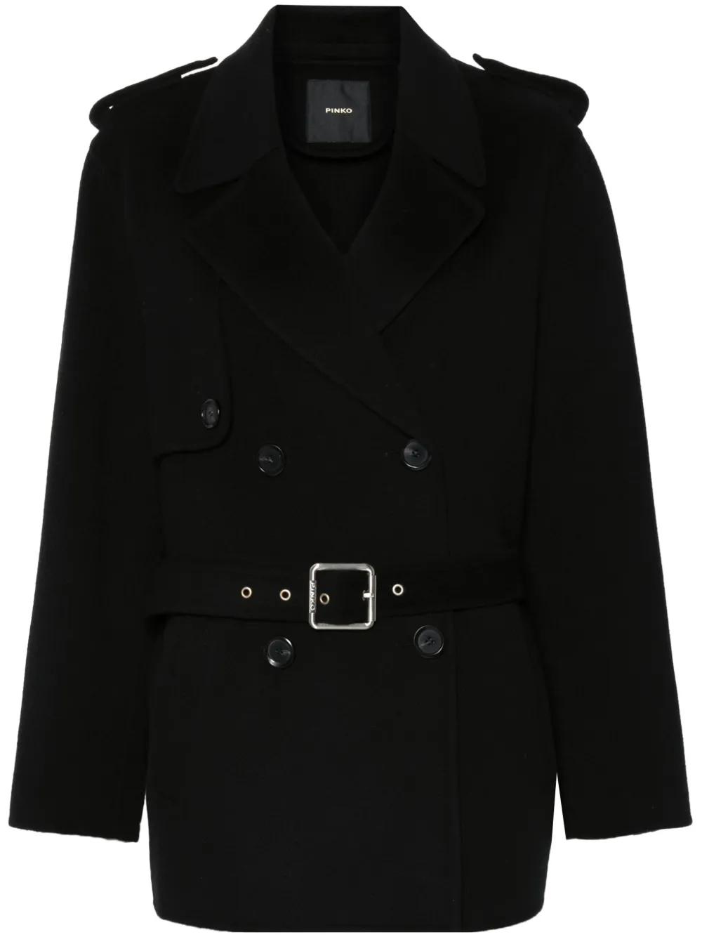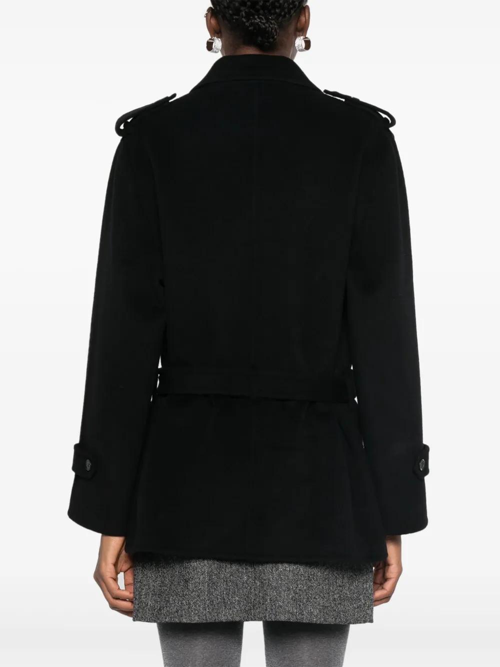 black wool belted waist buttoned epaulettes on shoulders and sleeves lapel collar double-breasted button fastening long sleeves slip pockets to the front