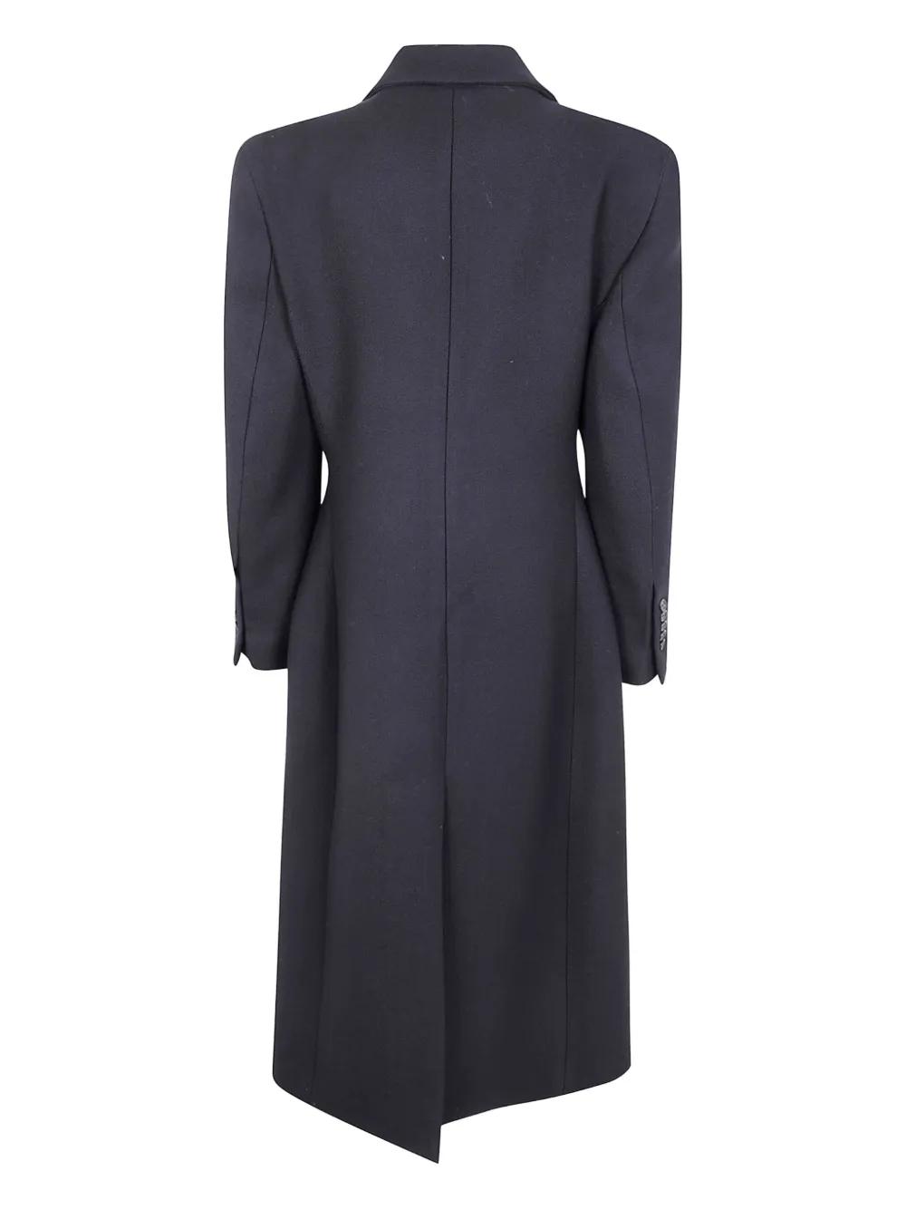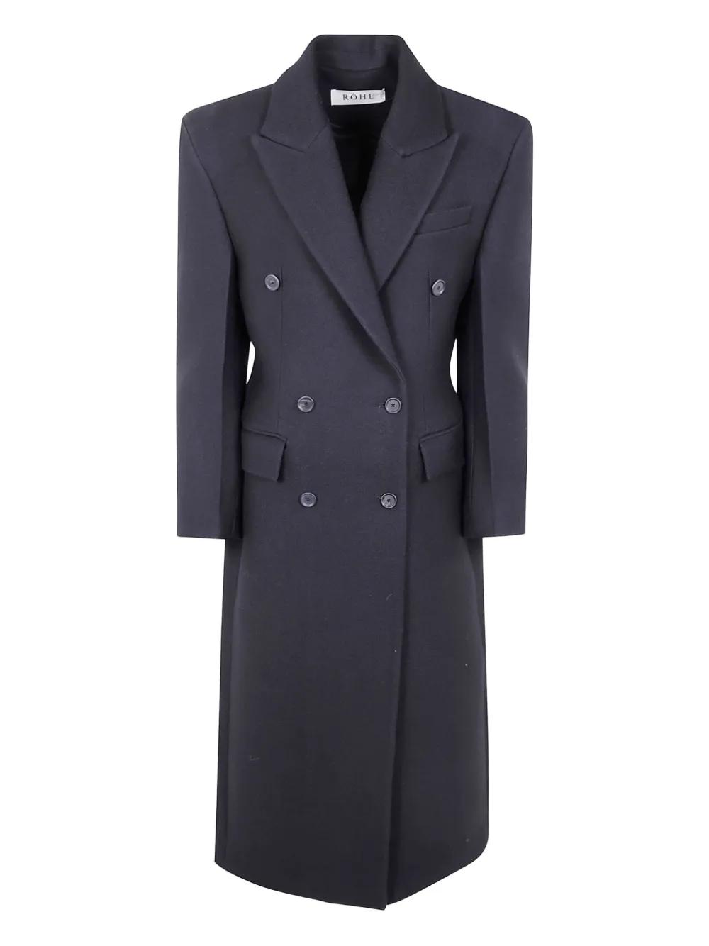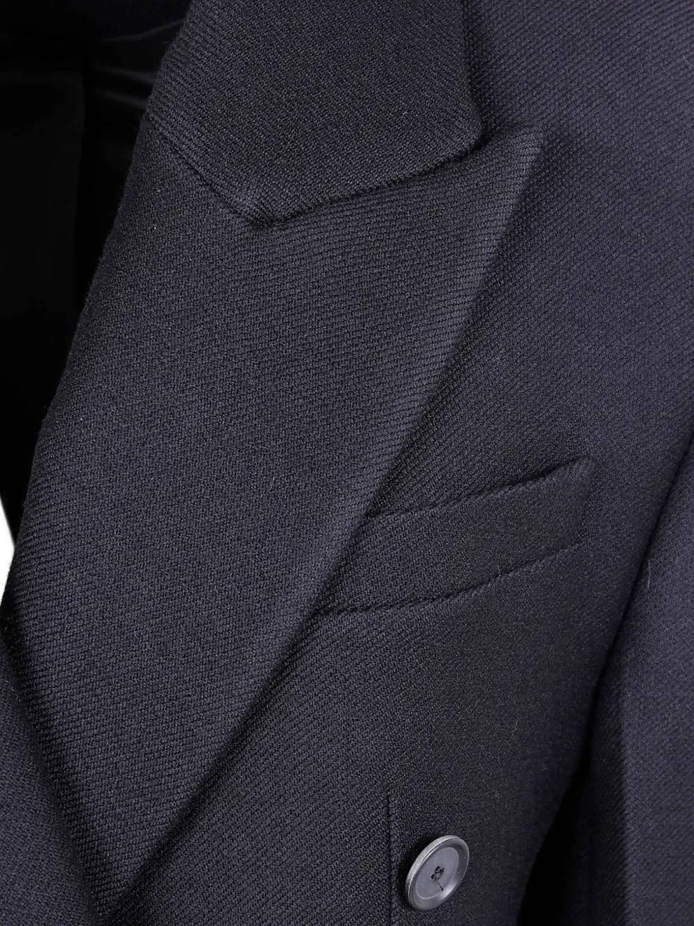 black double breasted button fastening peak lapels front flap pockets chest welt pocket