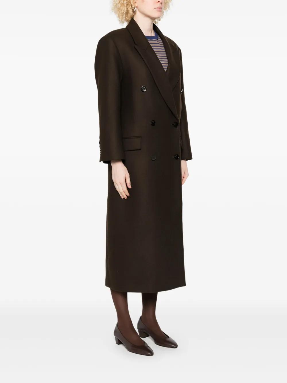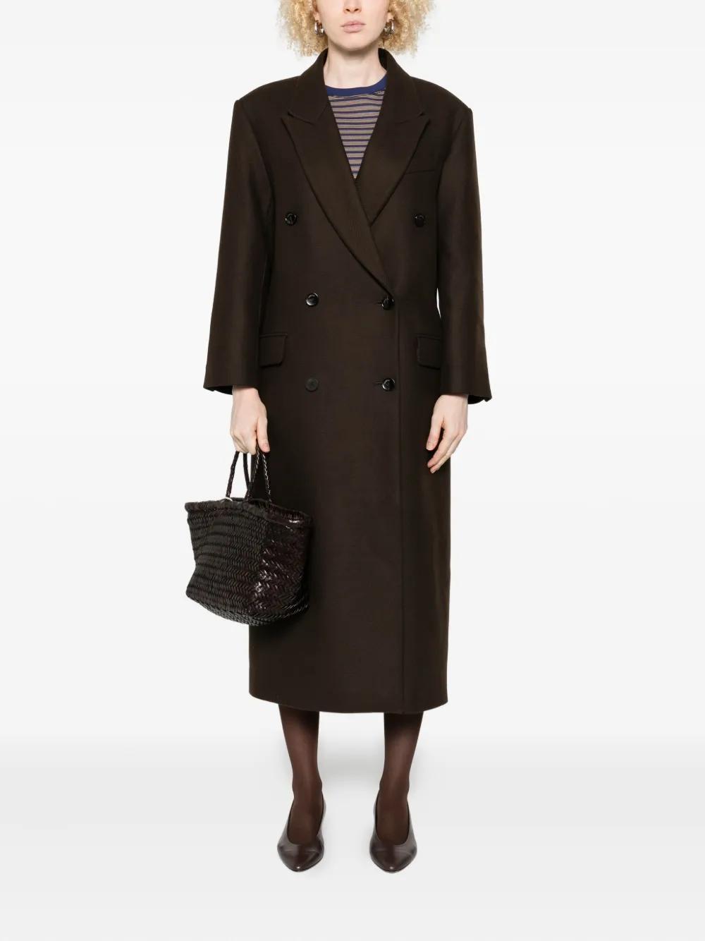 brown double-breasted fastening peak lapels long sleeves flap pockets straight hem