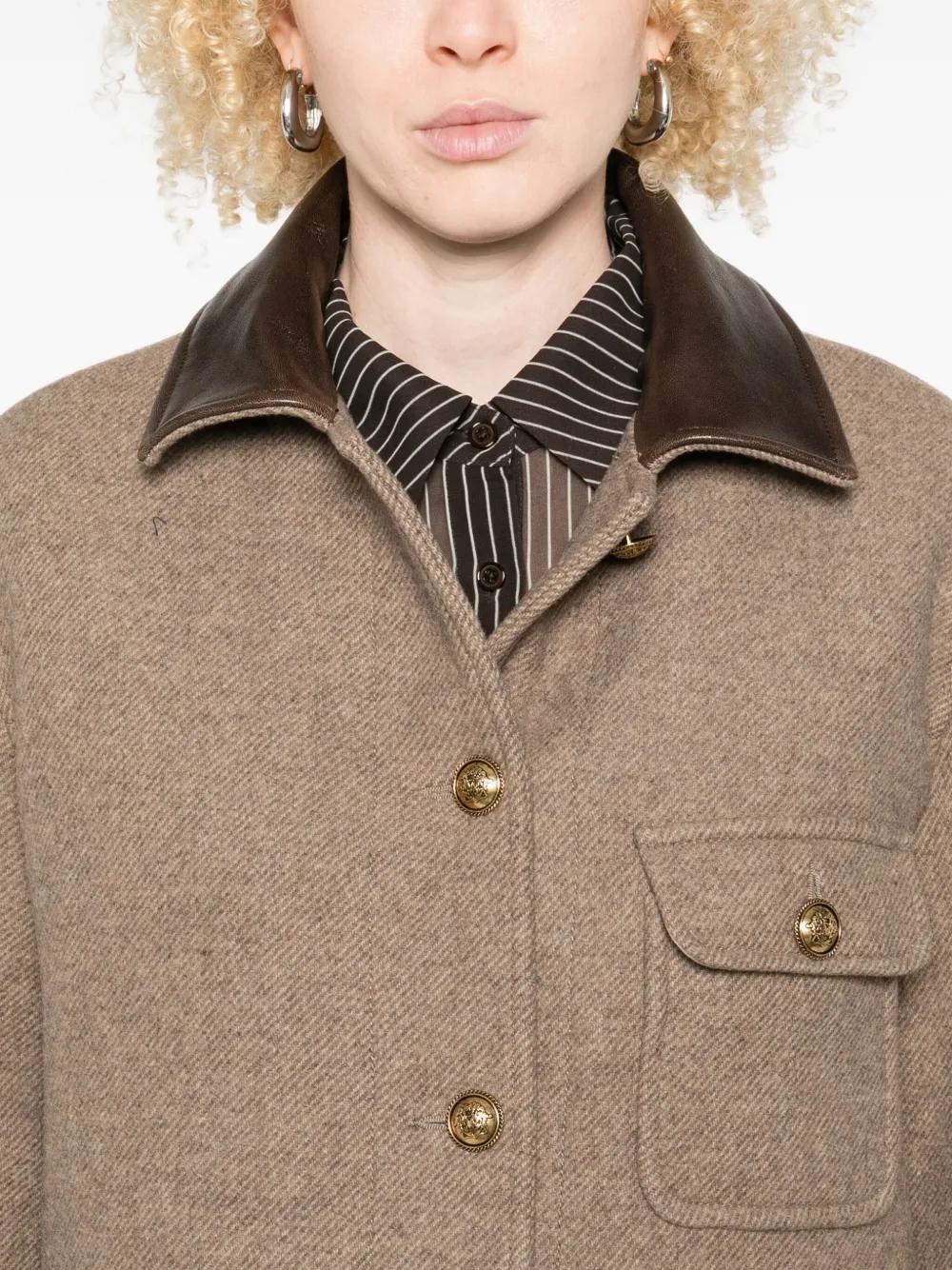 caramel brown contrasting collar gold-tone button fastening flap pockets long sleeves
