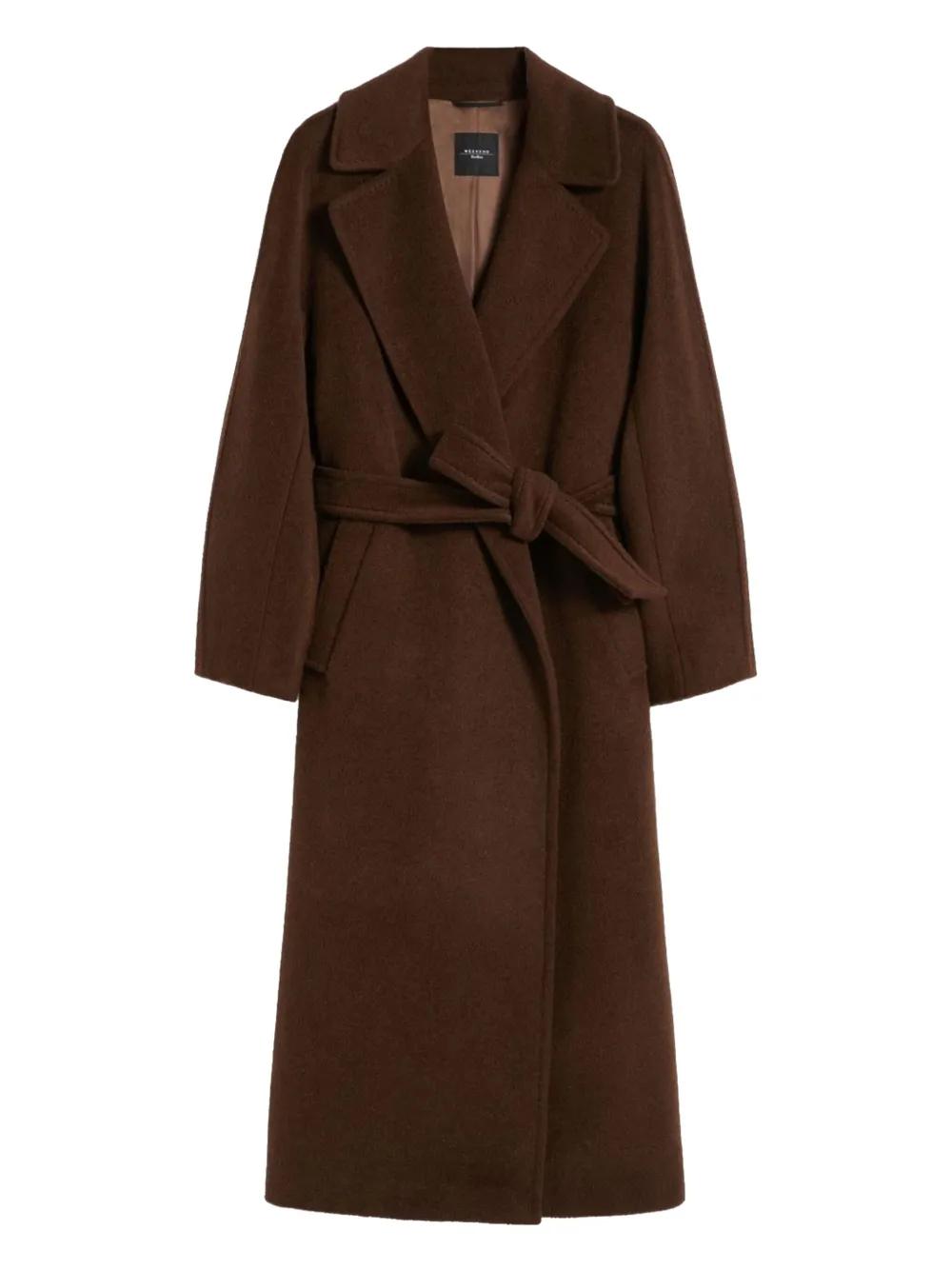 brown wide lapel collar matching belt side welt pockets central slit long sleeves