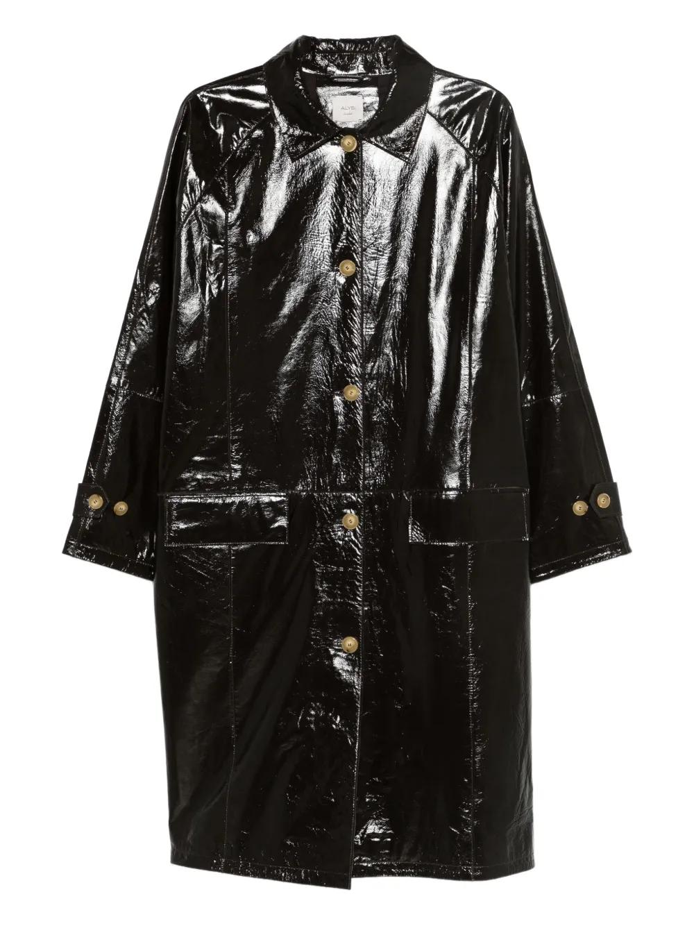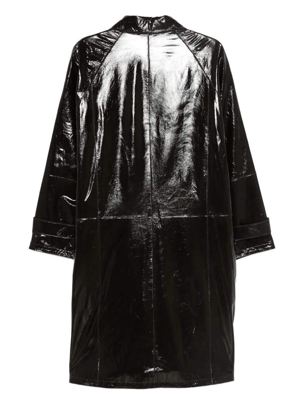 chocolate brown button fastening front pockets long sleeves classic collar patent finish