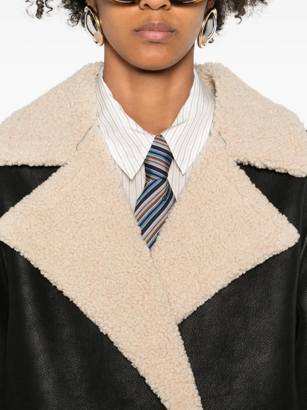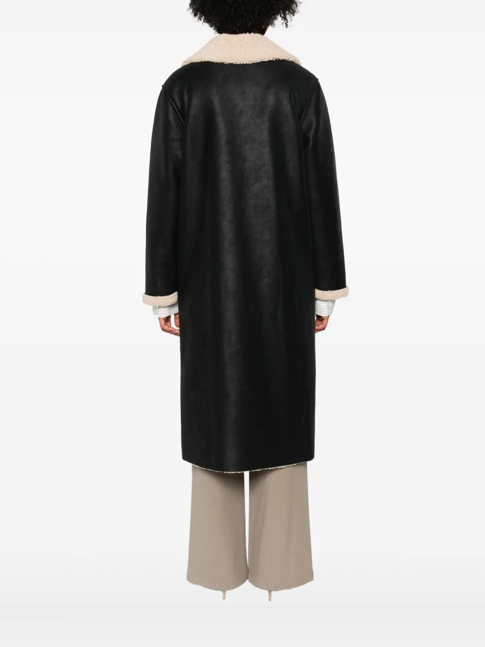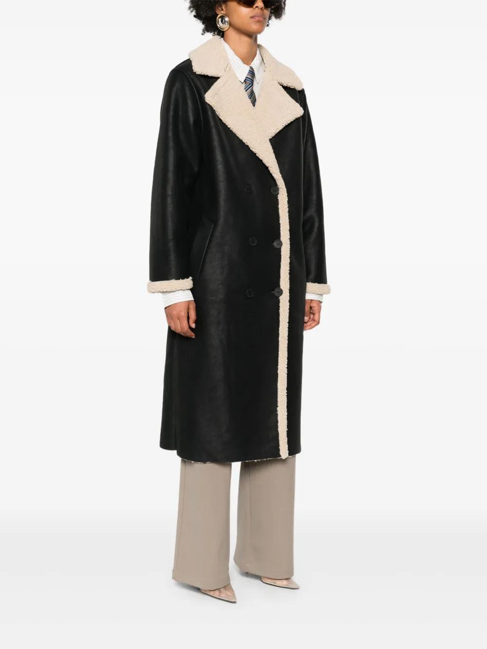 black double-breasted fastening fleece trim long sleeves patch pockets straight hemline