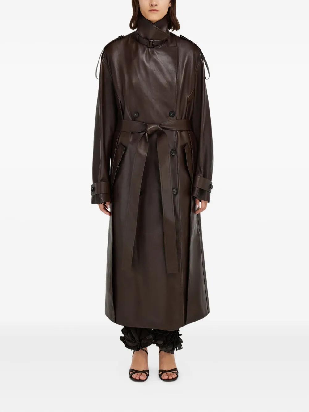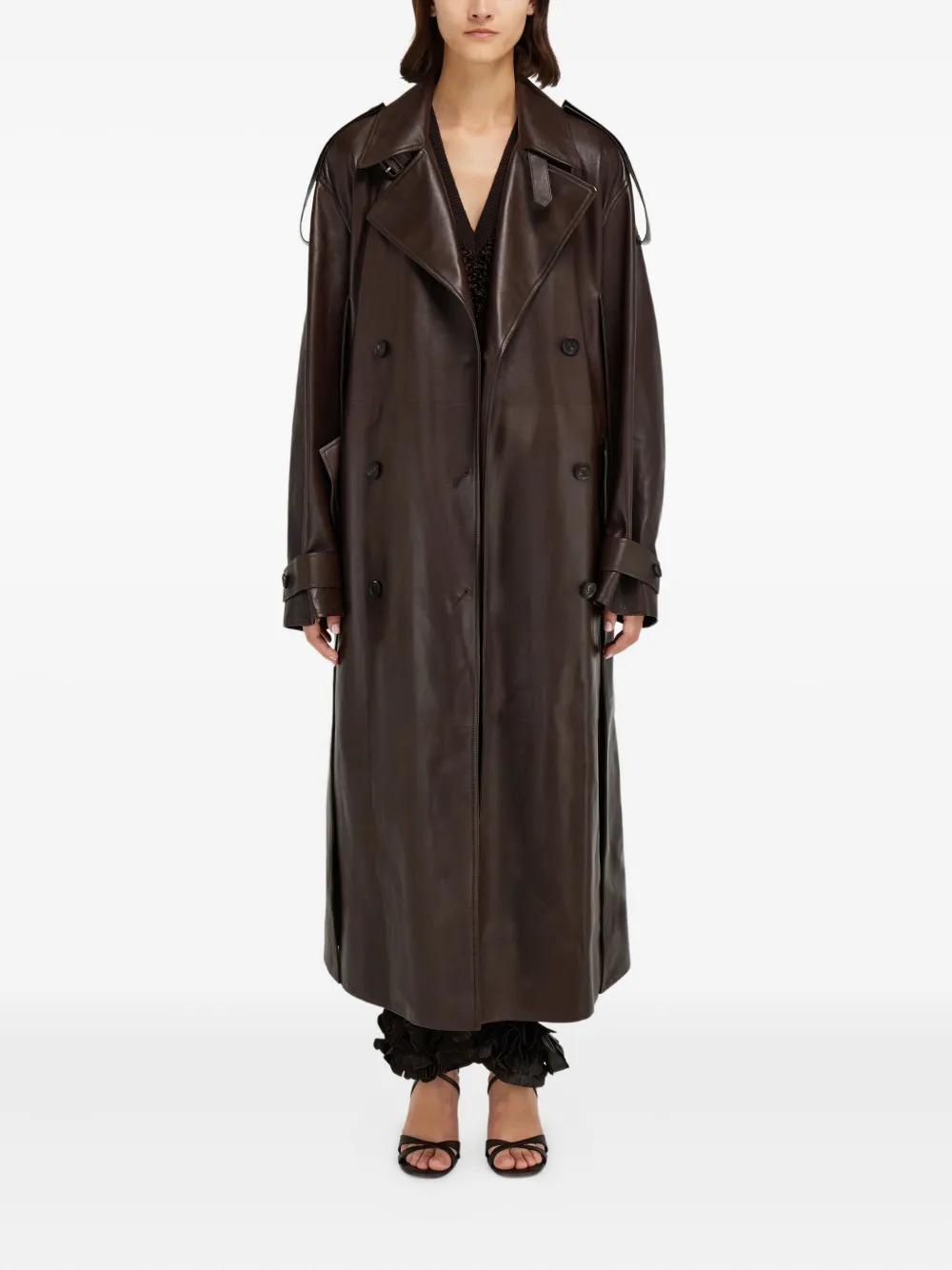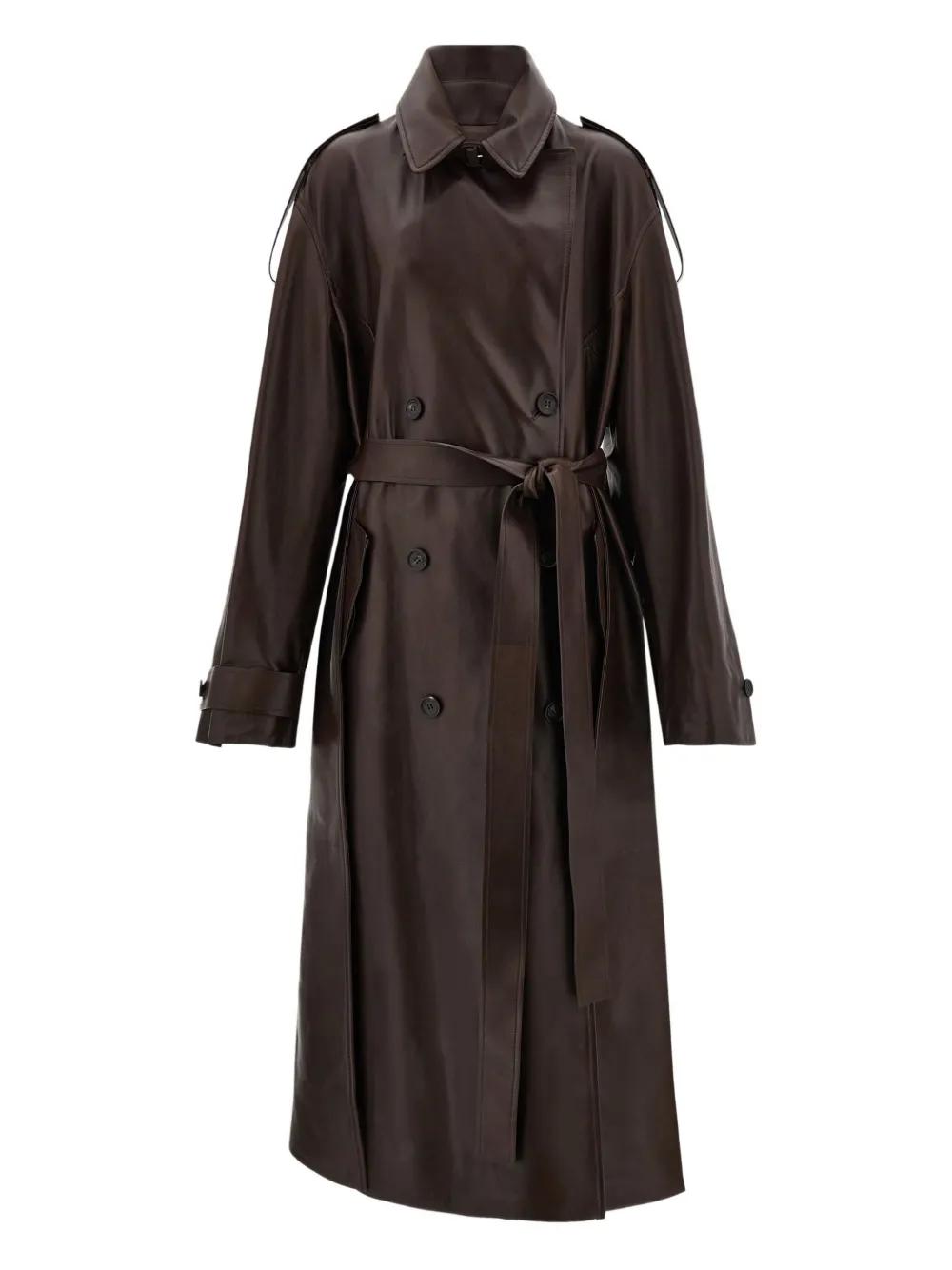chocolate brown notched lapels double-breasted button fastening long sleeves two side inset pockets ankle-length straight hem