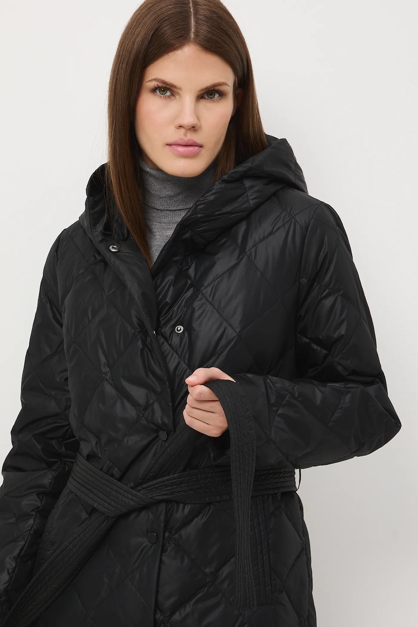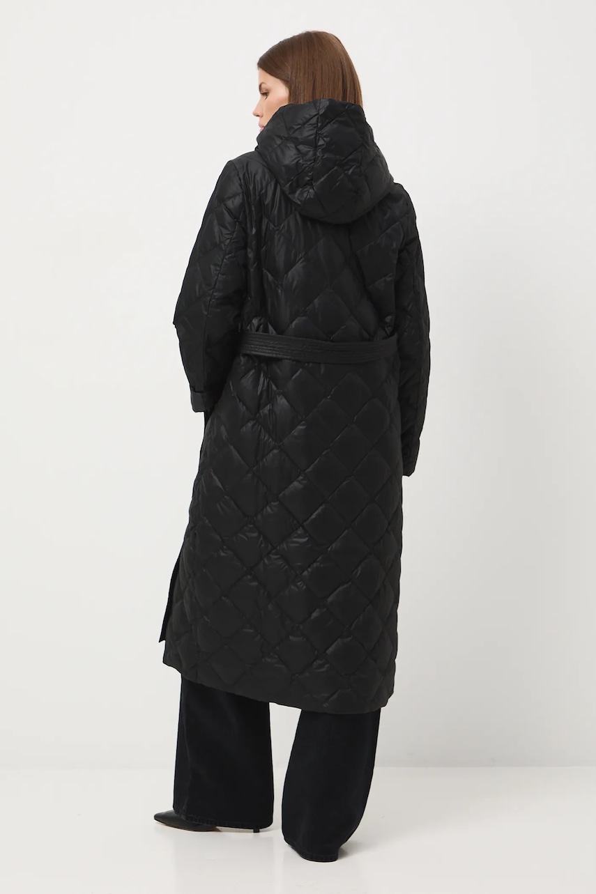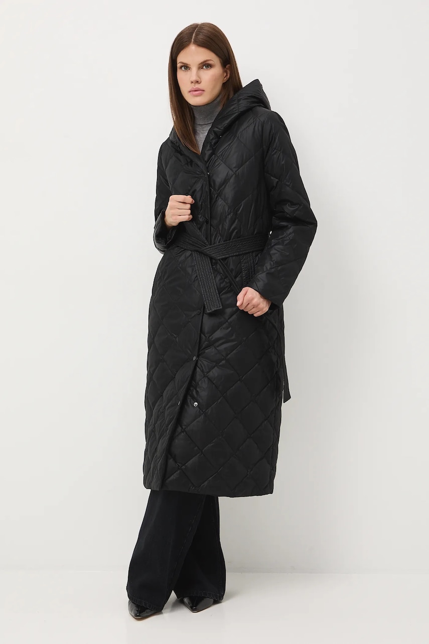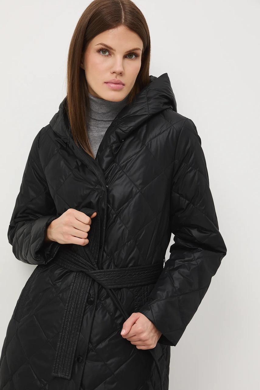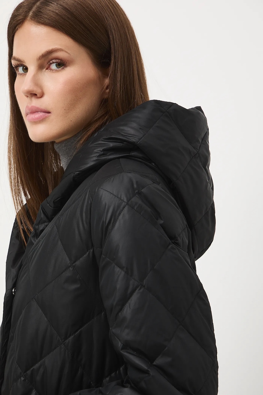 - Fason regular. - Długi rękaw. - Zapięcie na zatrzaski. - Model z kapturem. - Dwie wsuwane kieszenie boczne. - W talii pasek. - Ocieplony model na podszewce. - Wypełnienie z naturalnego puchu i pierza. - Pikowany model. - Długość rękawa: 64 cm. - Długość: 121 cm. - Szerokość w biuście: 56 cm. - Szerokość w barkach: 41,5 cm. - Wymiary podane dla rozmiaru: S.