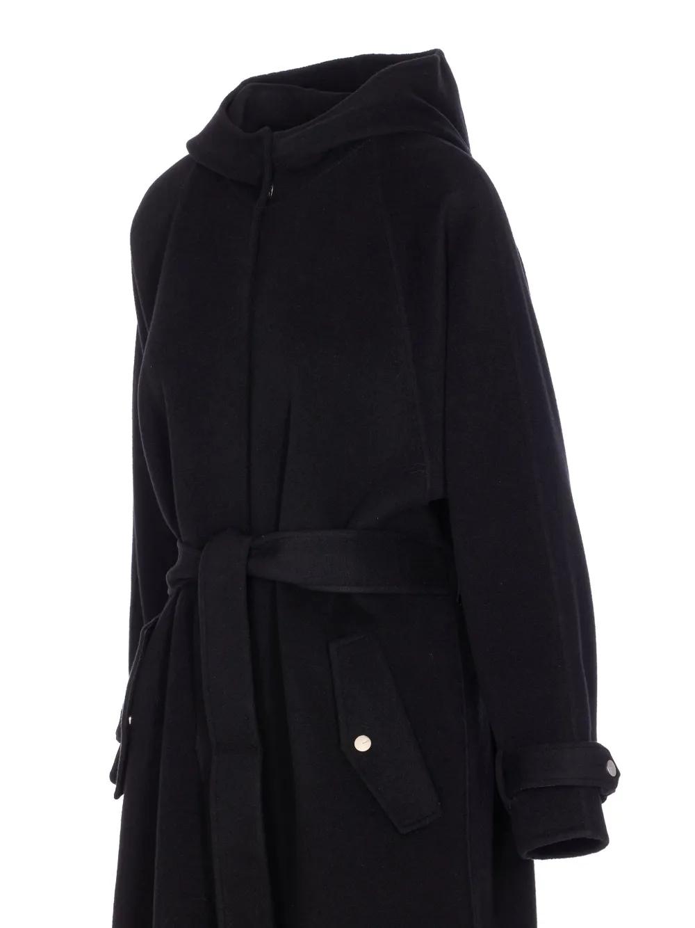 black raglan sleeves self-tie belt hooded neckline welt pockets button fastenings