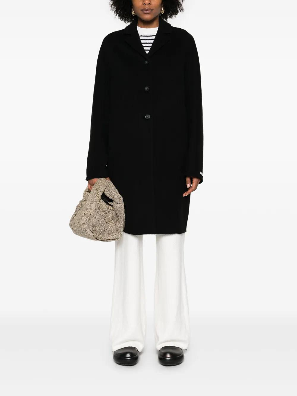 black front button fastening two side inset pockets notched lapels long raglan sleeves