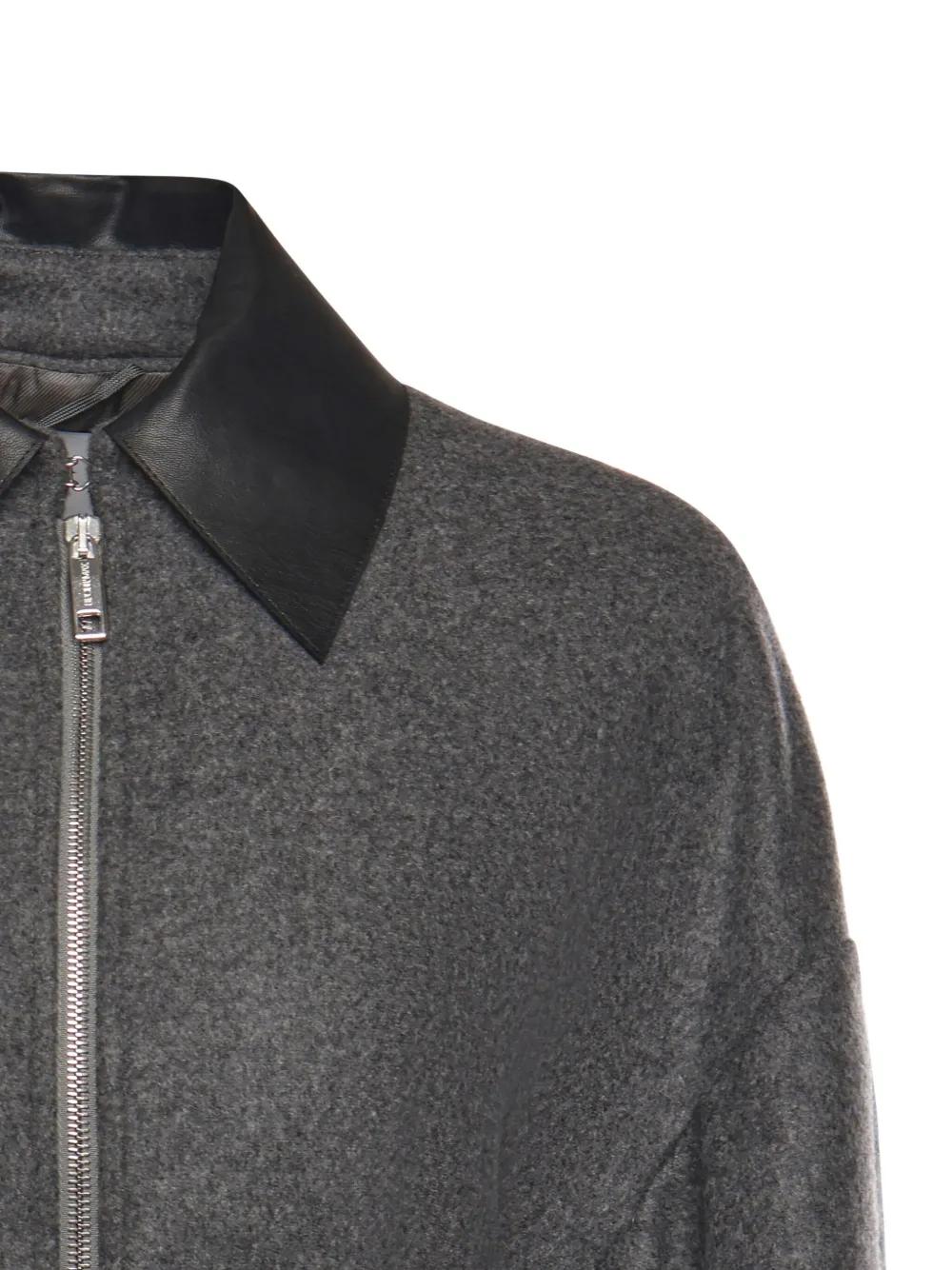 grey leather collar zip fastening belted long sleeves tonal stitching