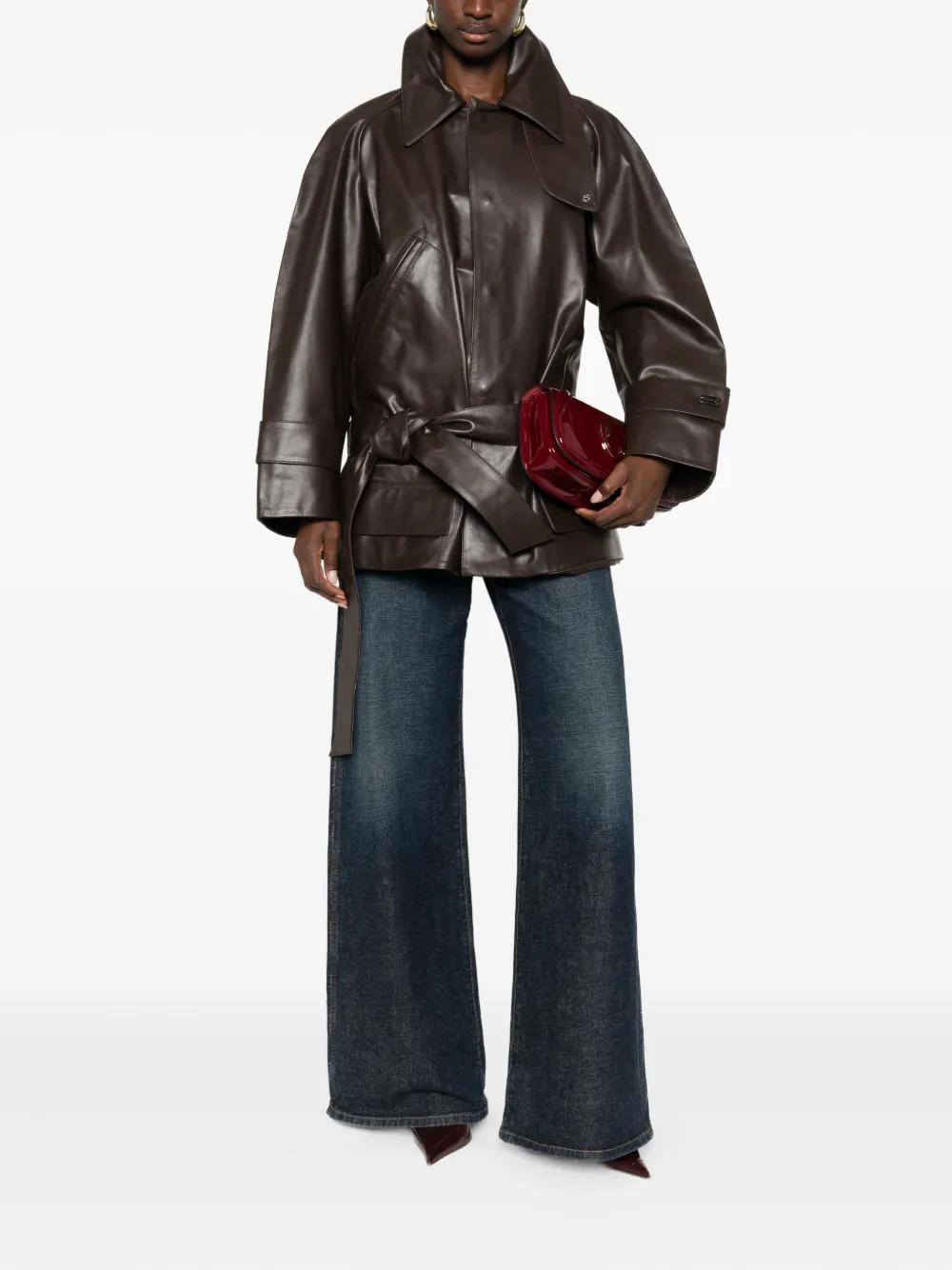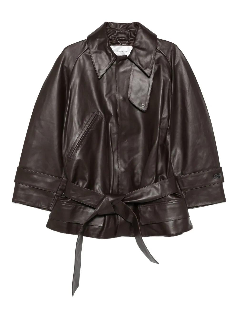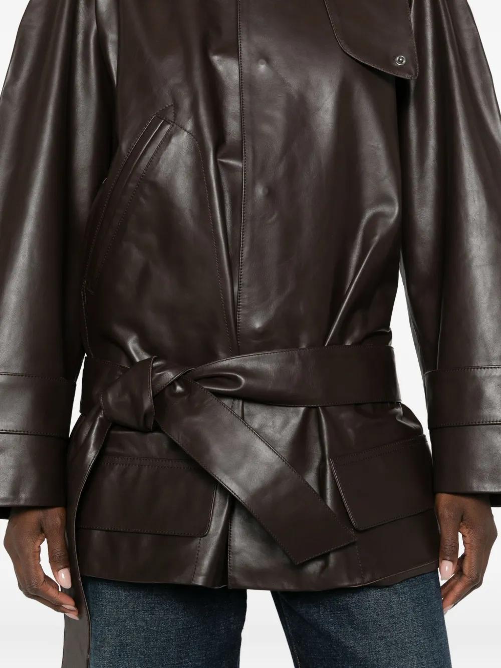 brown leather point collar front flap pockets adjustable belt long sleeves