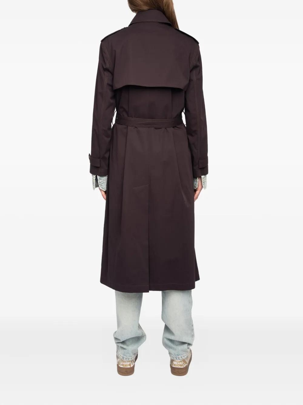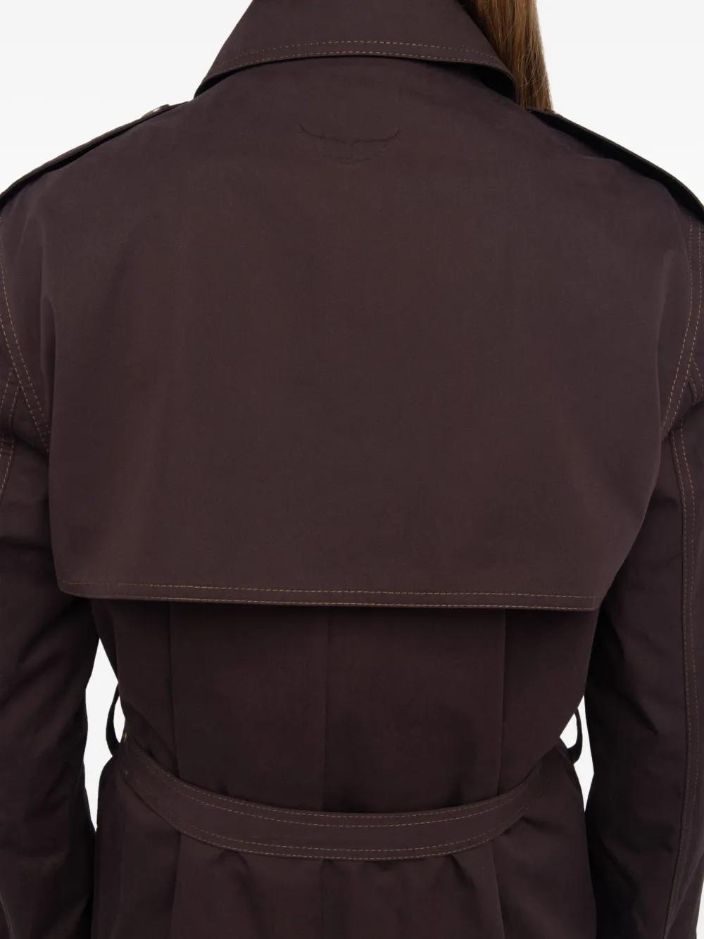 dark chocolate double-breasted closure belted waist epaulettes welt pockets contrast stitching