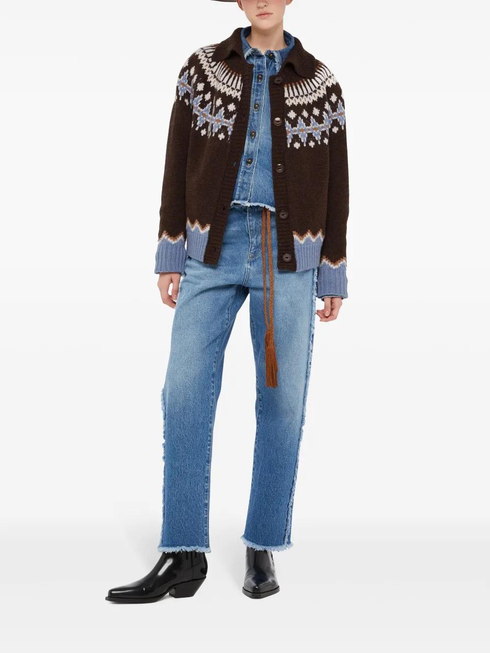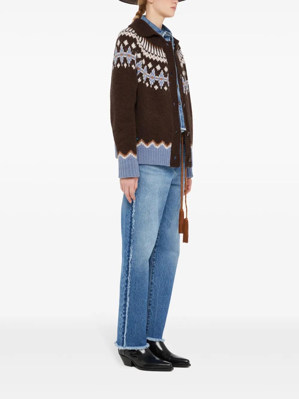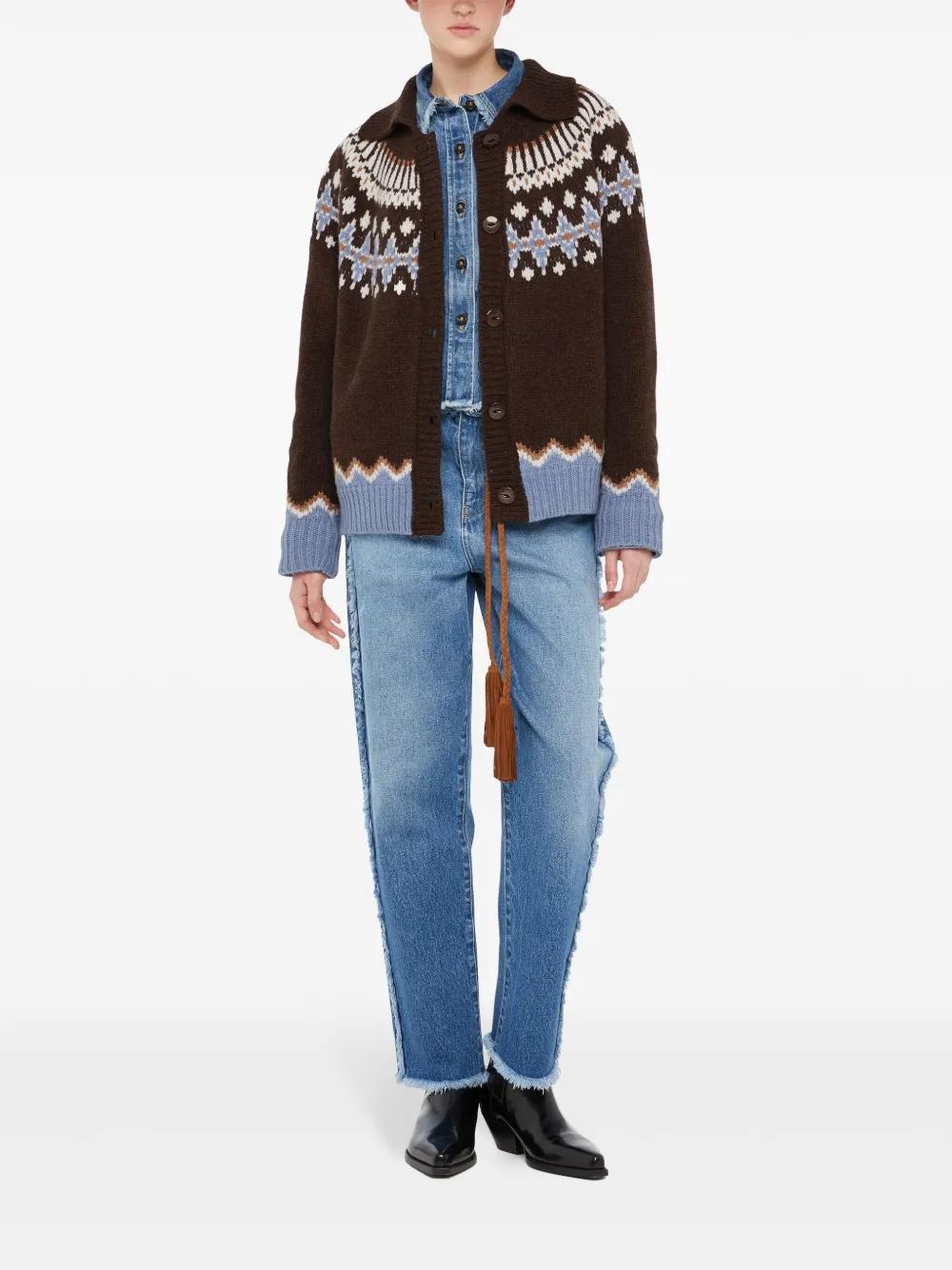 brown/multicolour virgin wool fair isle intarsia knit classic collar front button fastening long sleeves ribbed band collar ribbed cuffs and hem