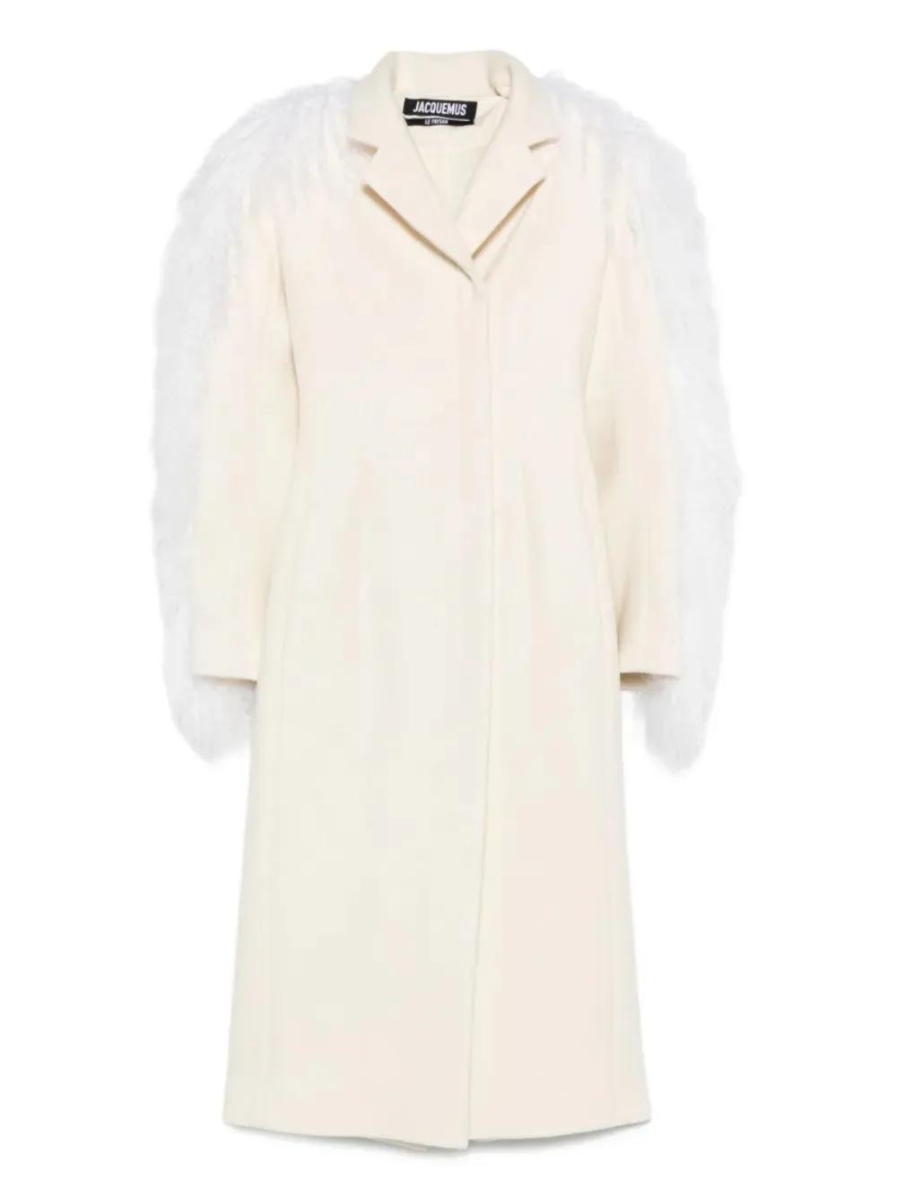 medium grey wool knitted construction logo-jacquard lining detachable and adjustable waist belt slouchy hood shawl lapels belt loops two front patch pockets long sleeves straight hem thigh-length