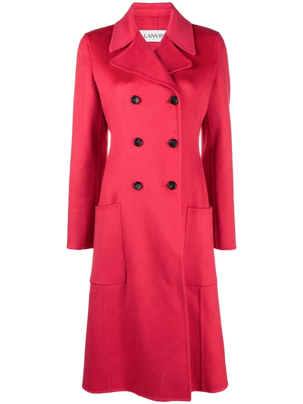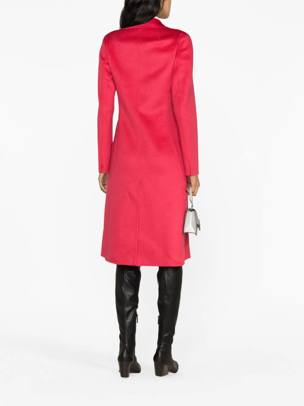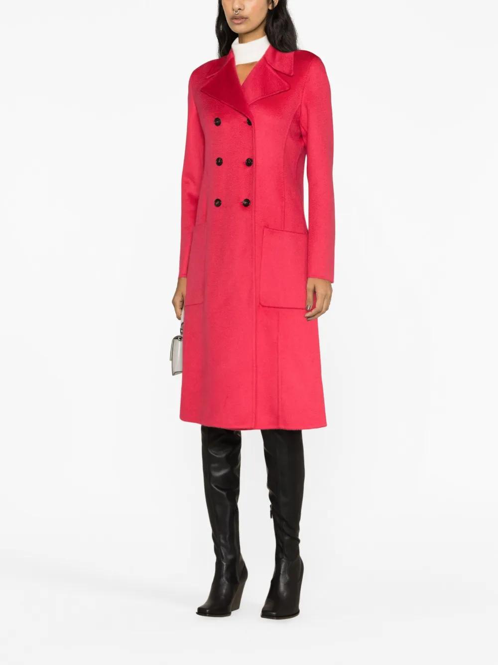 dark pink cashmere notched lapels double-breasted button fastening two side patch pockets long sleeves straight hem central rear vent