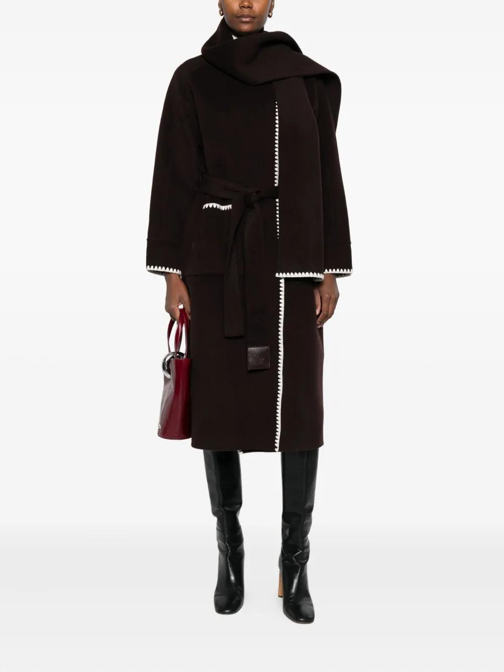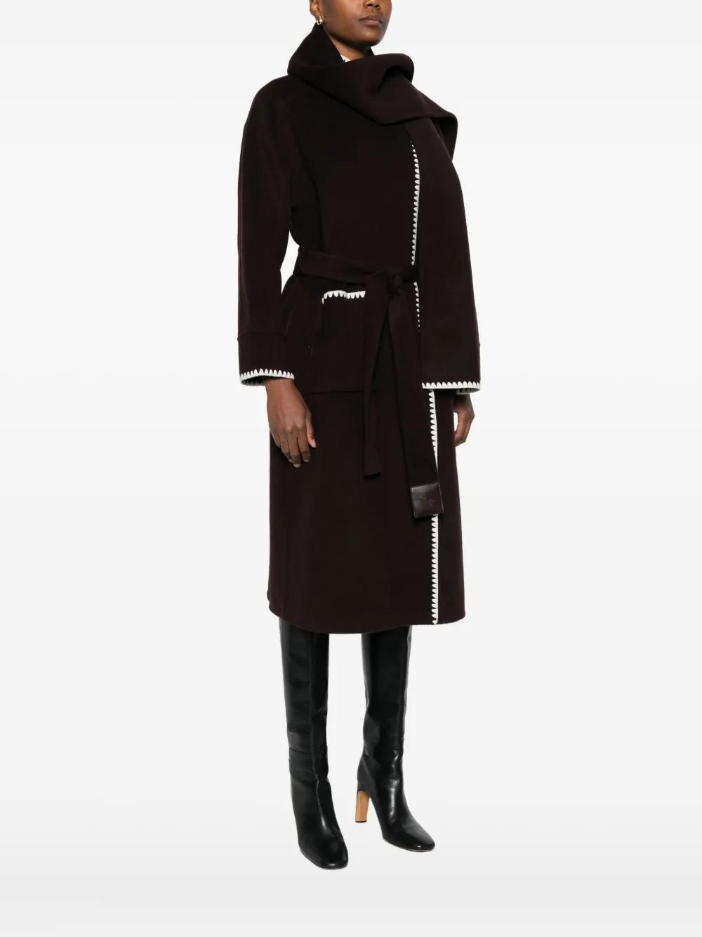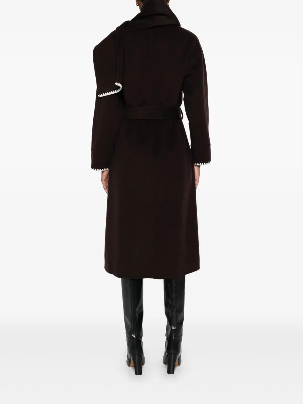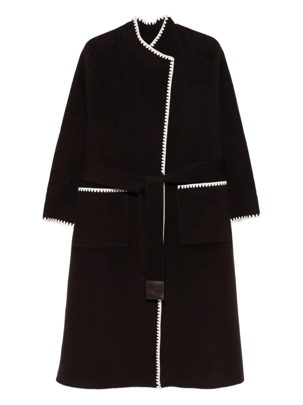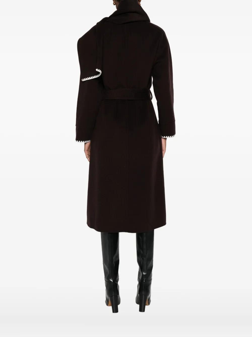 dark brown scalloped trim belted waist side pockets high neck self-tie belt long sleeves