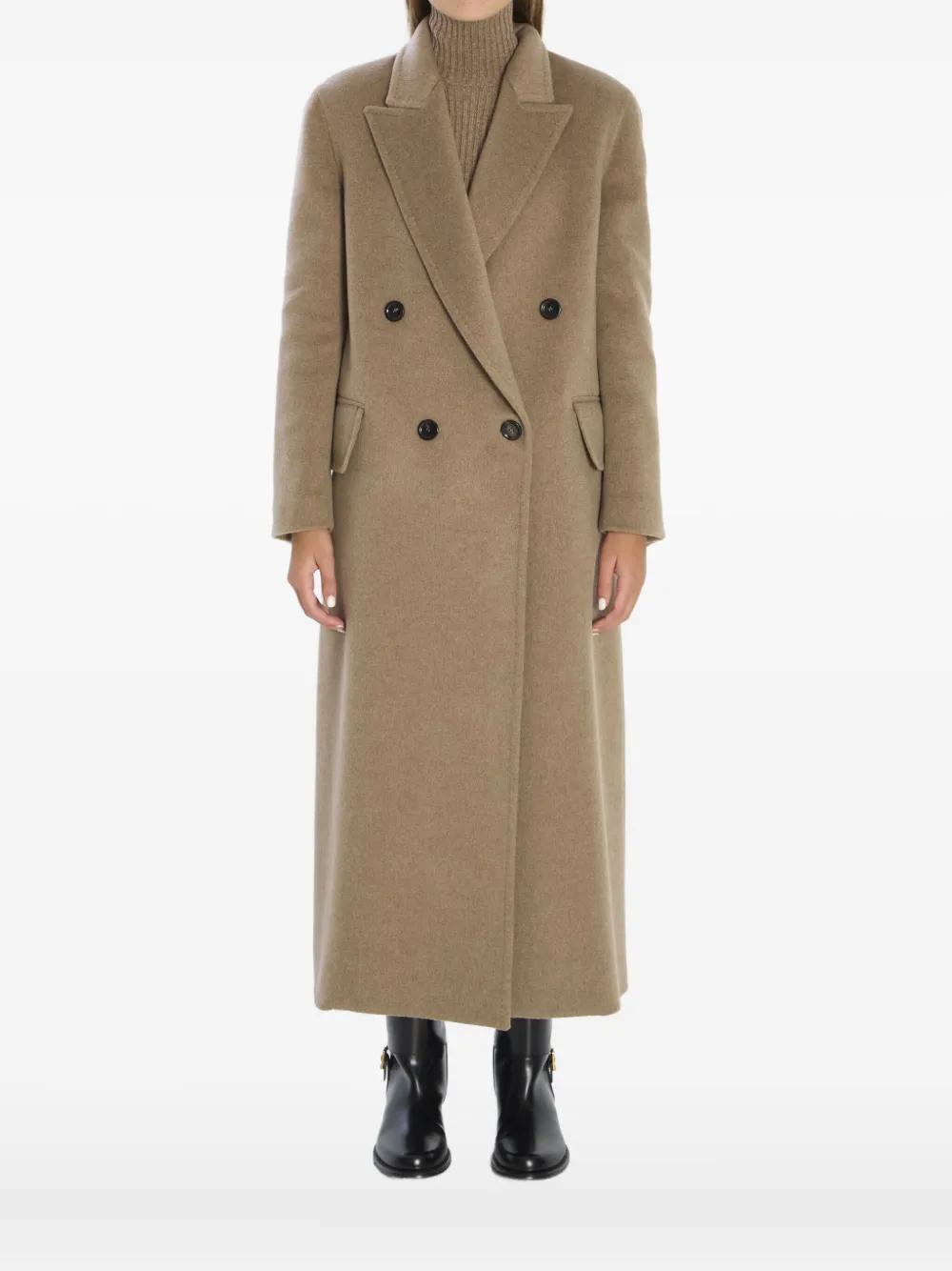 beige cashmere peaked lapels double-breasted closure four buttons flap patch pockets buttoned cuffs