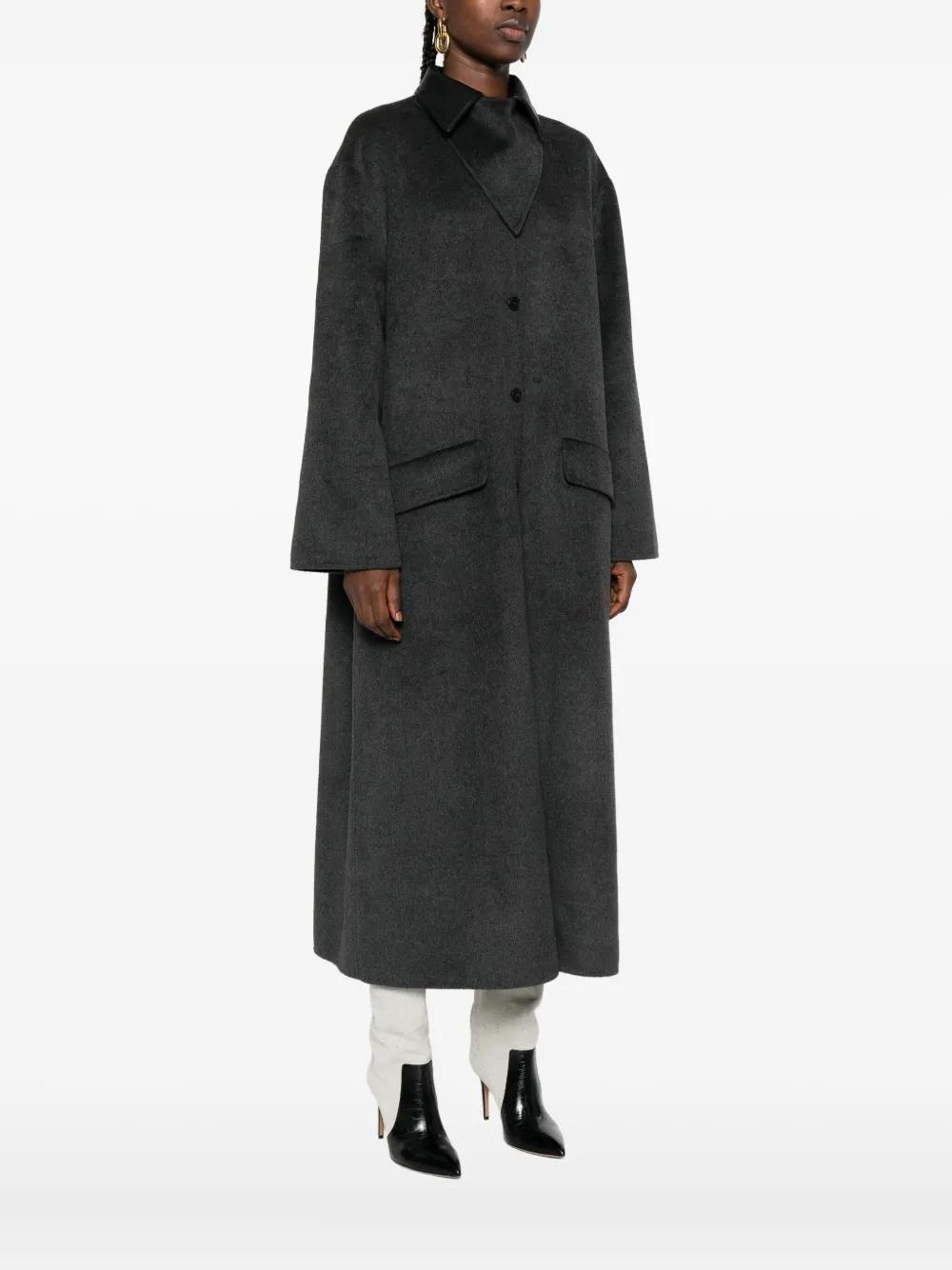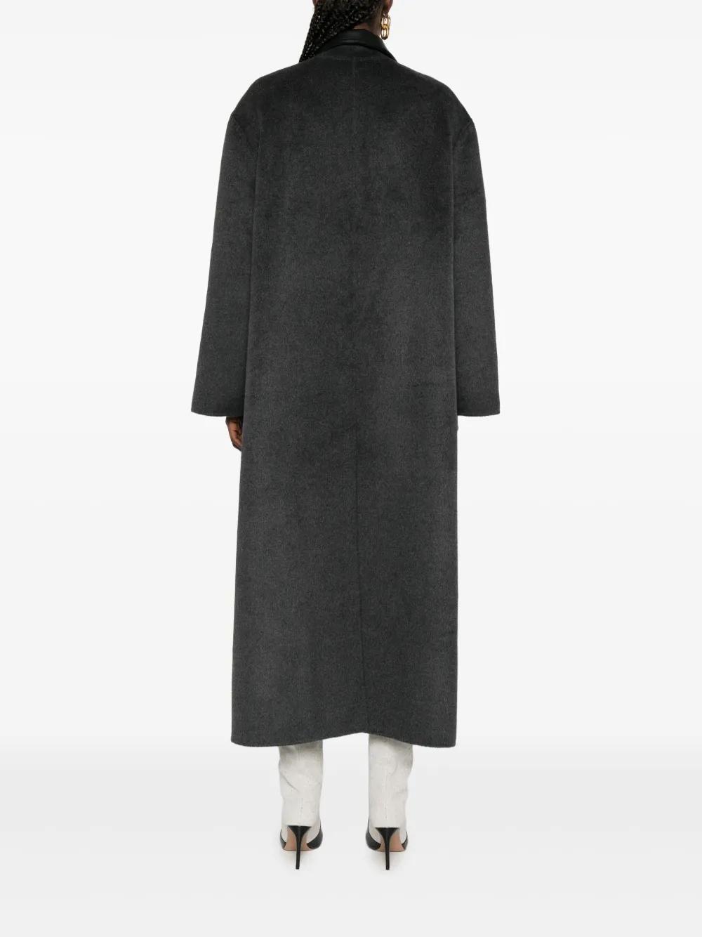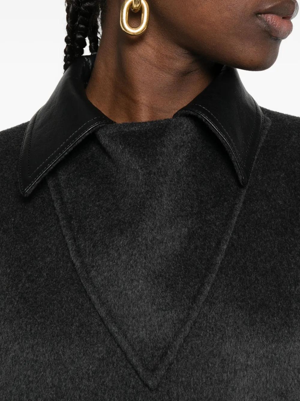 dark grey wool material contrast leather collar button fastening welt pockets A-line shape