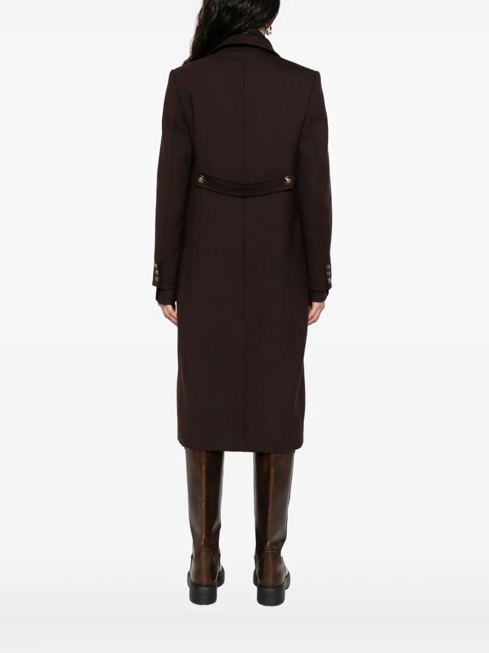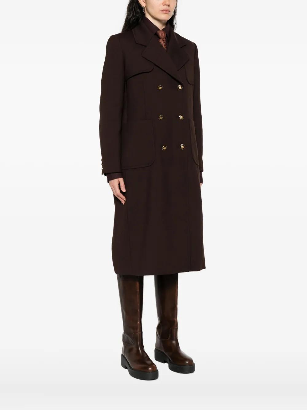 brown double-breasted fastening patch pockets long sleeves notched lapels buttoned strap at the back